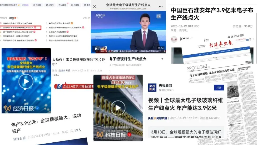 3月18日,中国巨石淮安全球最大电子玻纤生产线点火,燃爆全网!新华社、央视等15家权威主流媒体集中报道,行业内外刷屏热议。作为全球首个玻纤零碳智能制造基地核心项目,这条年产10万吨的电子布生产线,以全球9%的产能占比,和零碳智造模式,强势领跑全球电子玻纤赛道。从淮安出发,中国巨石再立全球标杆,为数字中国建设筑牢关键材料底座!