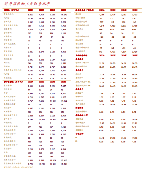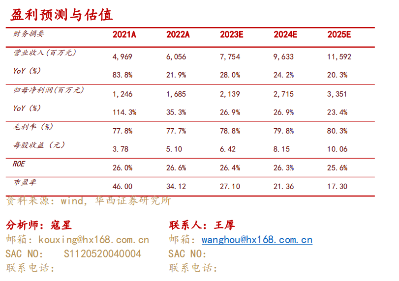 维持盈利预测不变,预计23-25年营业总收入77.54/96.33/115.92亿元;归母净利润21.39/27.15/33.51亿元;EPS 6.42/8.15/10.06元;2023年5月4日收盘价174元对应PE分别27/21/17倍,维持“买入”评级。
