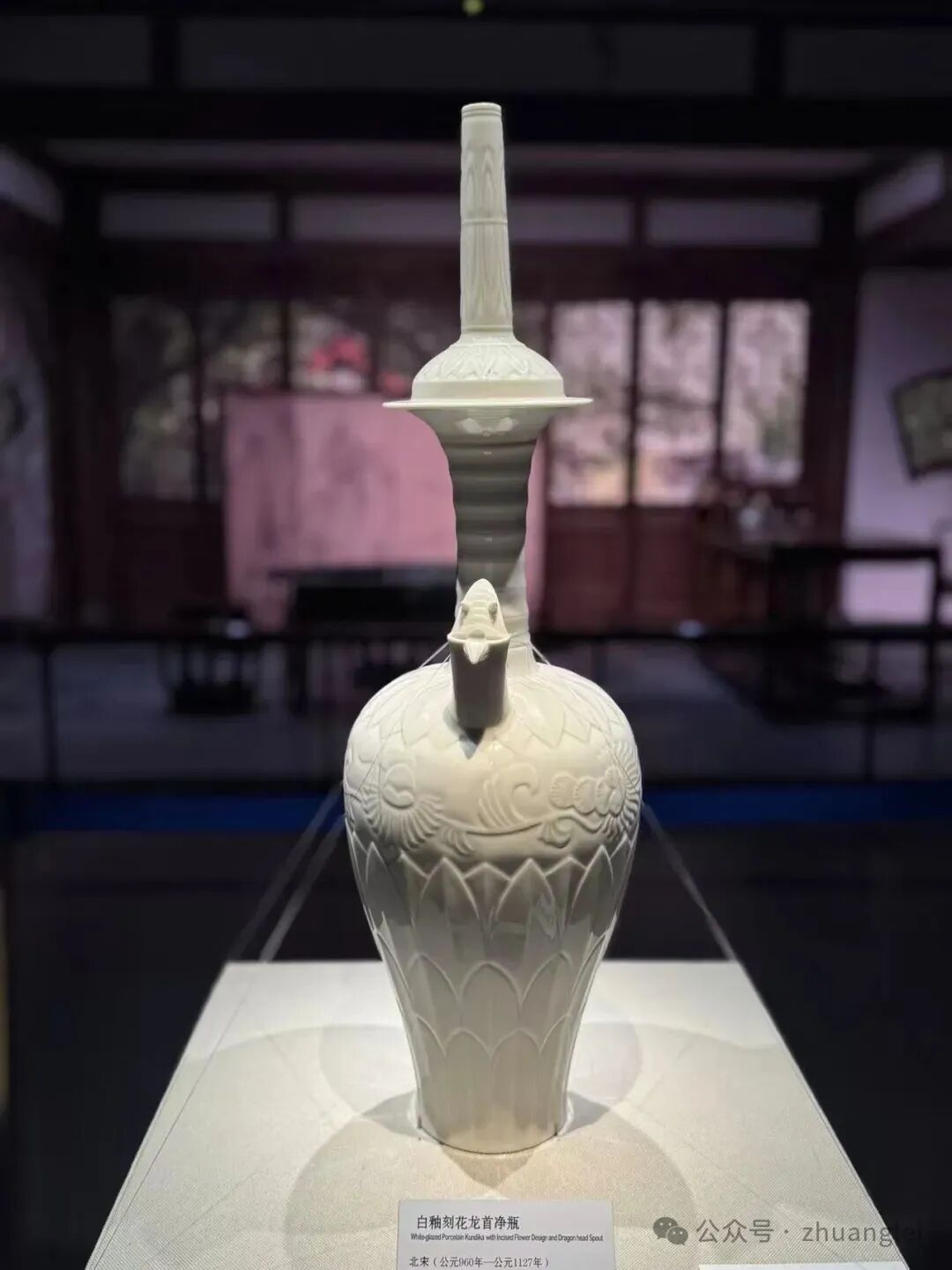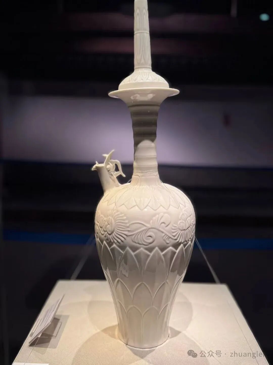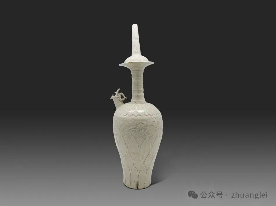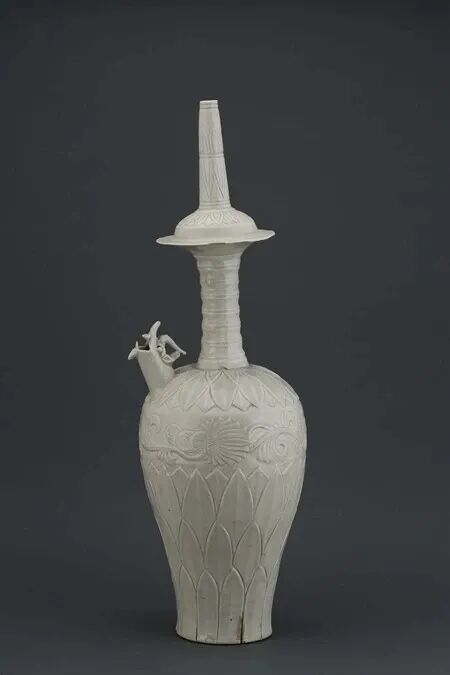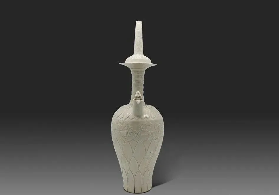 定窑白釉刻花龙首净瓶烧制于北宋,高60.9厘米,腹径19.1厘米 底径10.1厘米, 1969年定州市净众院塔基地宫出土。作为定窑唯一存世的大型净瓶,其出土填补了宋代佛教器物与定窑大型瓷器研究的空白。