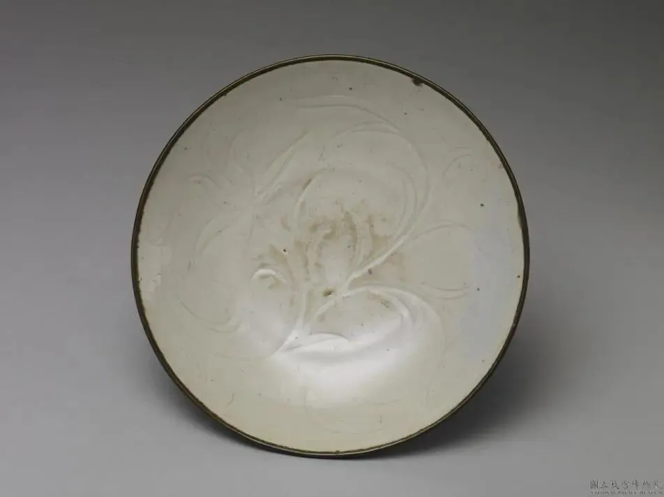 宋-元 定窑 白瓷划花莲纹盘 台北故宫藏 敞口浅盘,圆弧形壁,平底矮圈足。全器施牙白色釉,口缘无釉,镶铜边。器内通壁与底划花饰一屈绕之折枝莲花。圈足似经刮削露胎,且残酱褐色遗痕。