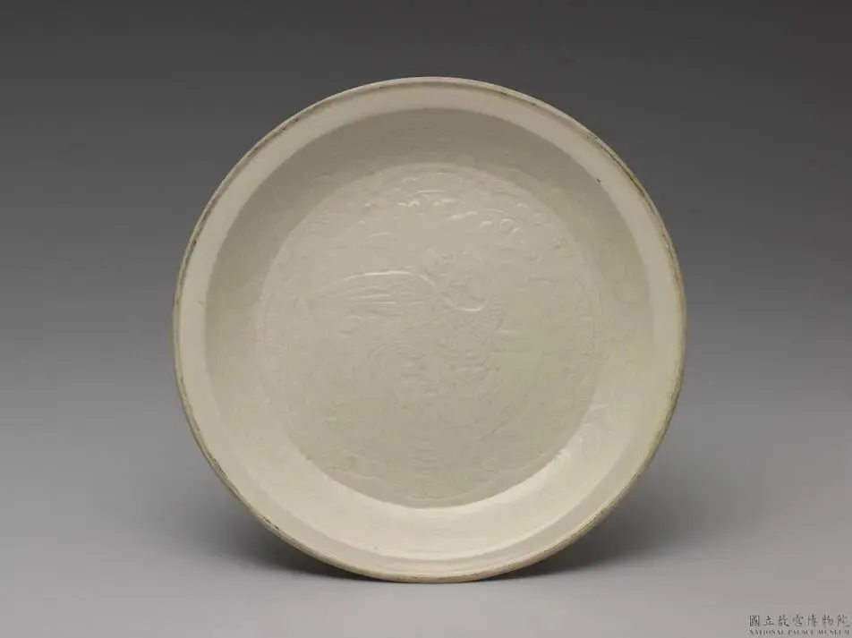 北宋至金 定窑 白瓷印花凤纹折沿盘 台北故宫藏 折沿浅盘,敞口、底宽平浅挖成足。器满釉仅口部凸唇的窄边芒口、无釉、露白胎,器内模印纹饰。盘面作八花瓣开光,开光具宽边框,框上作转枝花卉;开光内为回首张翅作舞的凤鸟,尾羽下垂,缠枝小花衬满隙地。开光之外的盘面为细卷草,侧壁为四季花与双弦纹边。全器纹饰密布,而层次井然;细视盘面纹饰层次变化,层层高低不一,可见雕刻笵模工匠的巧艺。