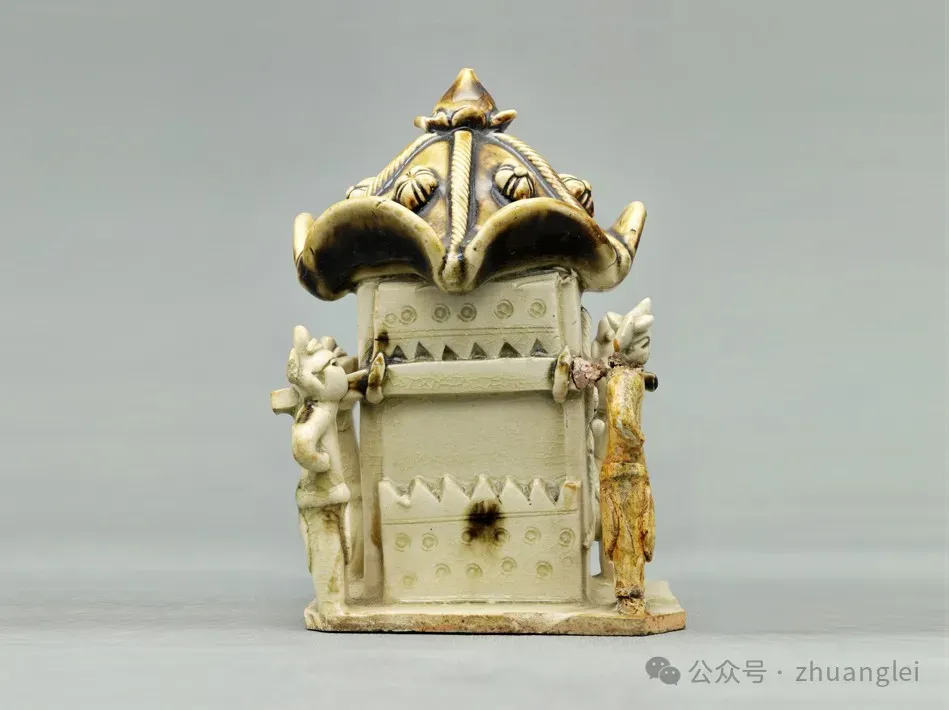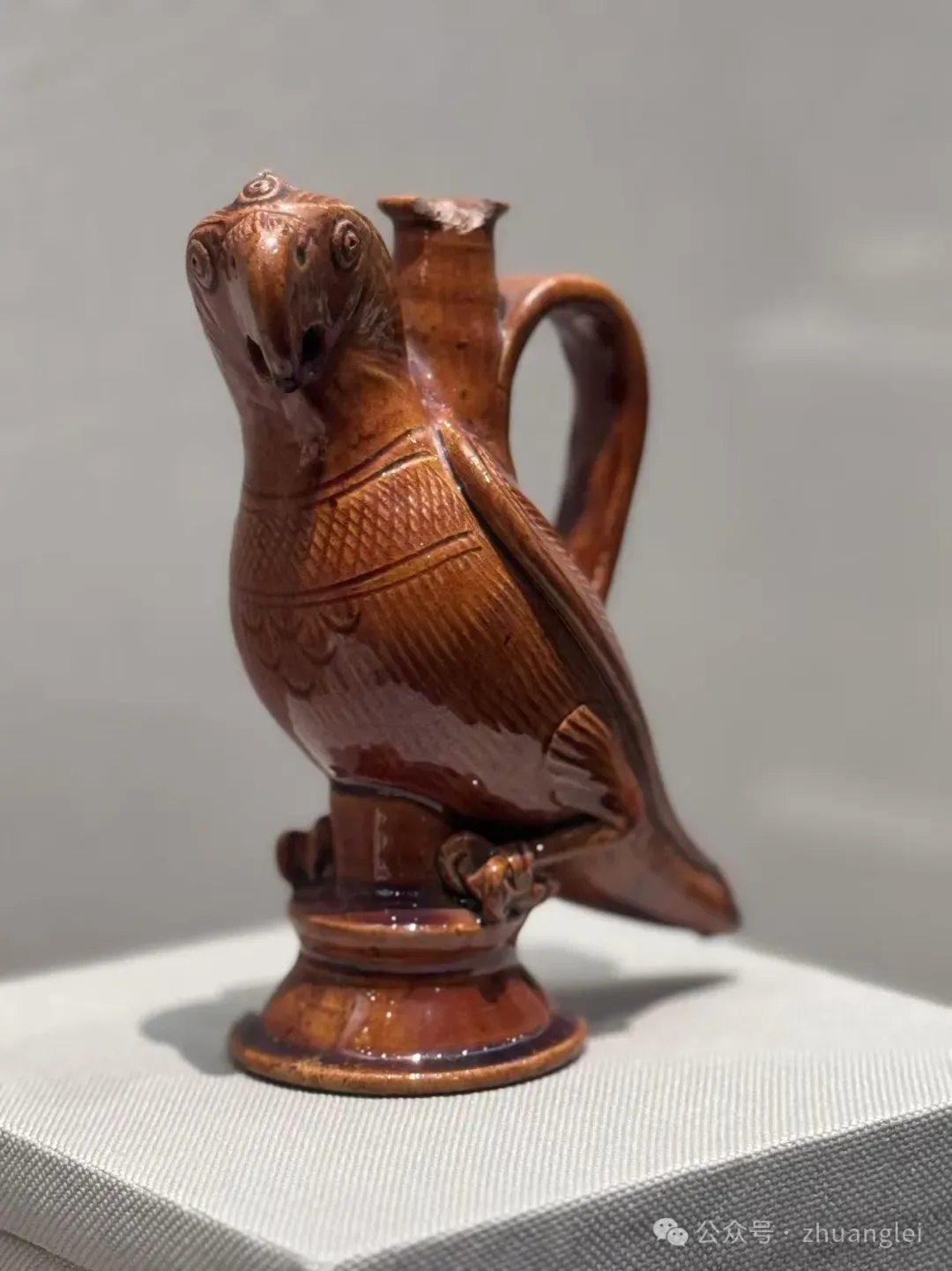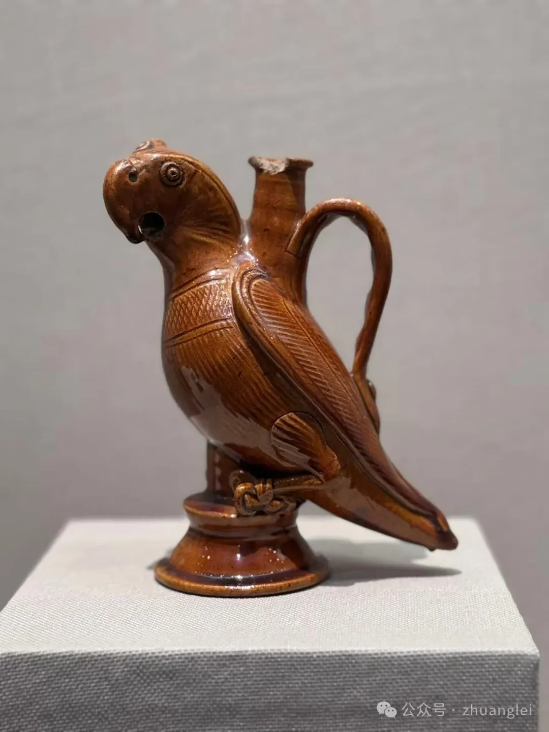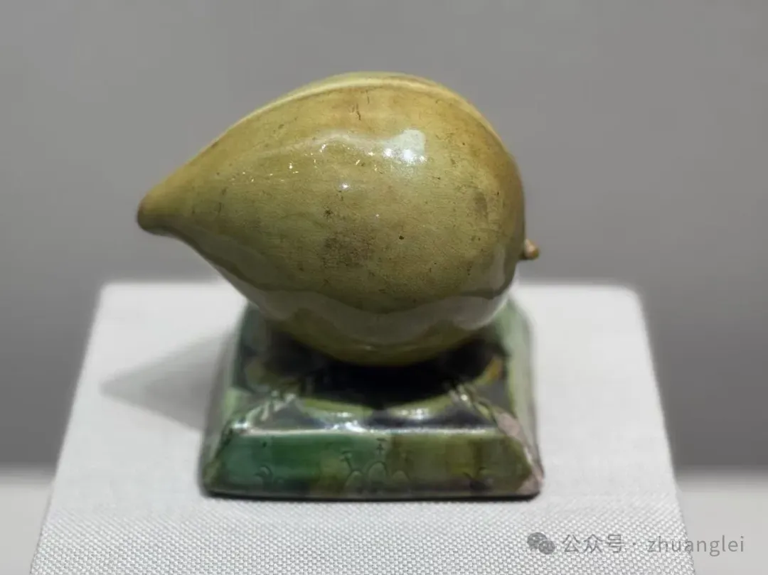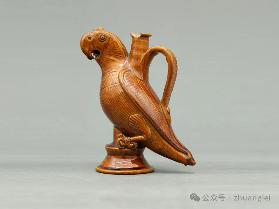 北宋 定窑黄釉鹦鹉壶 定州博物馆藏 陶胎呈黄褐色,质粗松。通体施黄釉,釉色黄而莹润亮泽。作鹦鹉形,鹦鹉立于覆盆状底座之上,以堆塑、刻划技法制作。勾喙为壶流,双目圆睁,头顶饰流苏。背负一长颈注,注口圆唇外翻,注颈与鹦鹉背之间安半环柄。鹦鹉体态肥壮,长尾稍翘,篦划羽纹,胸部饰斜格纹宽带,又在柄端附贴装饰。圈足底面墨书“鹦鹉”二字。形象生动逼真,实用性与艺术性结合,是北宋低温釉陶精品。