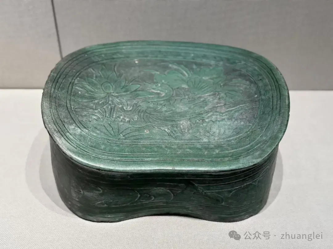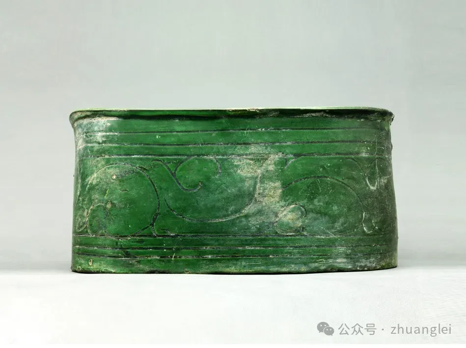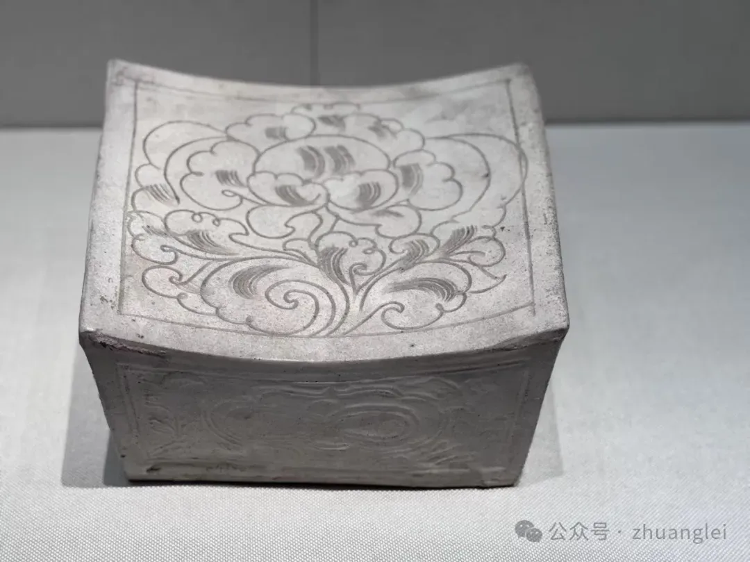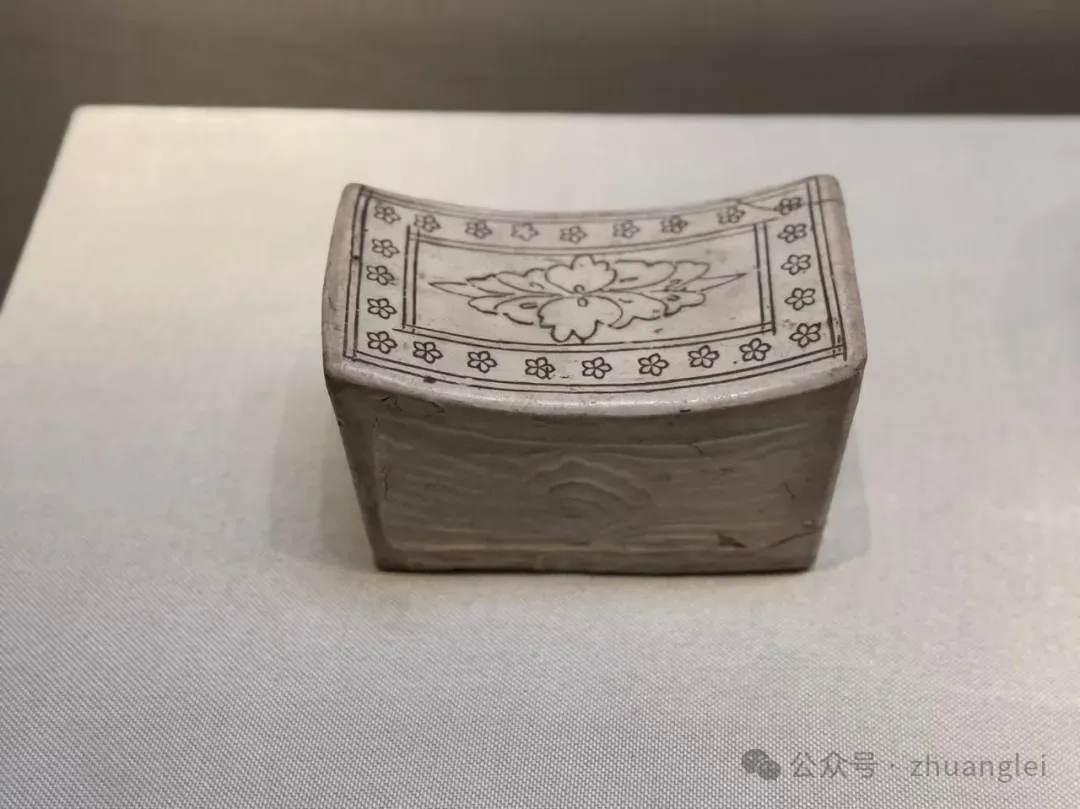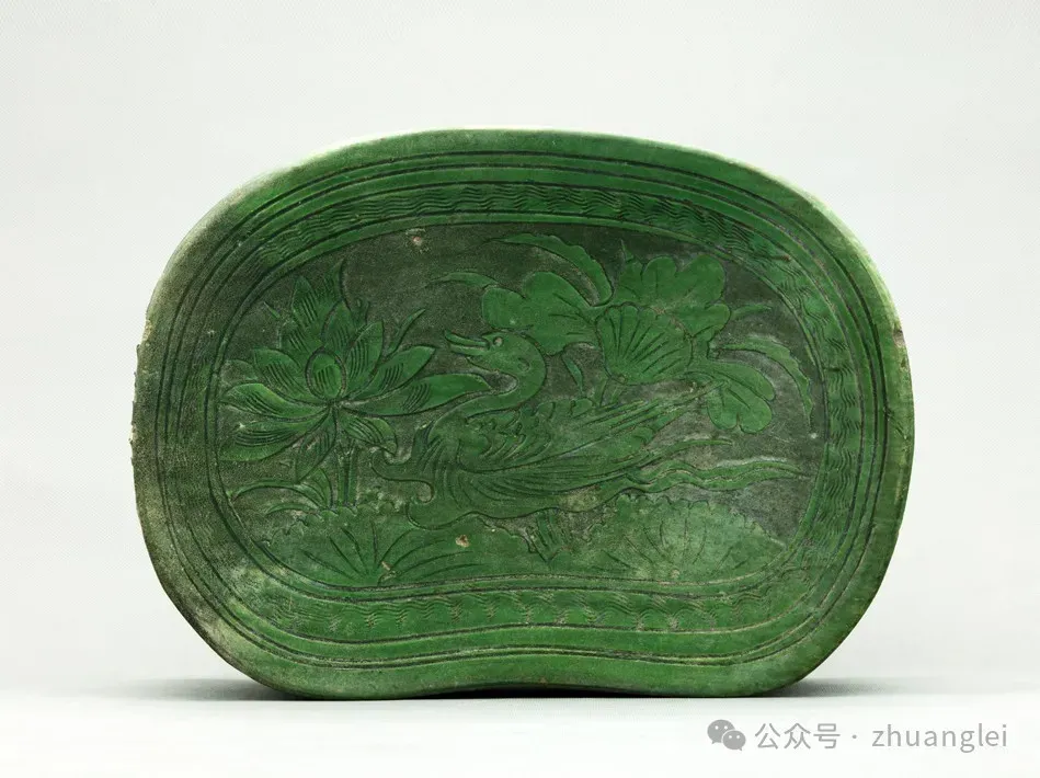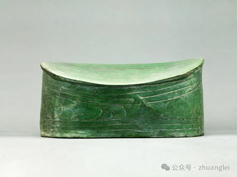 北宋 定窑绿釉游鸭纹枕 定州博物馆藏 枕略呈椭圆形,枕 面 前 低 后高,两端翘起,出短檐。直壁,平底,底有两气孔。枕面剔荷叶及盛开荷花,一只鸭悠游于荷花丛中,篦划叶脉及羽毛纹。侧壁饰弦纹及草叶纹。胎较粗,灰白色,施化妆土。全器施翠绿釉,底露胎,是少见的定窑绿釉珍品。