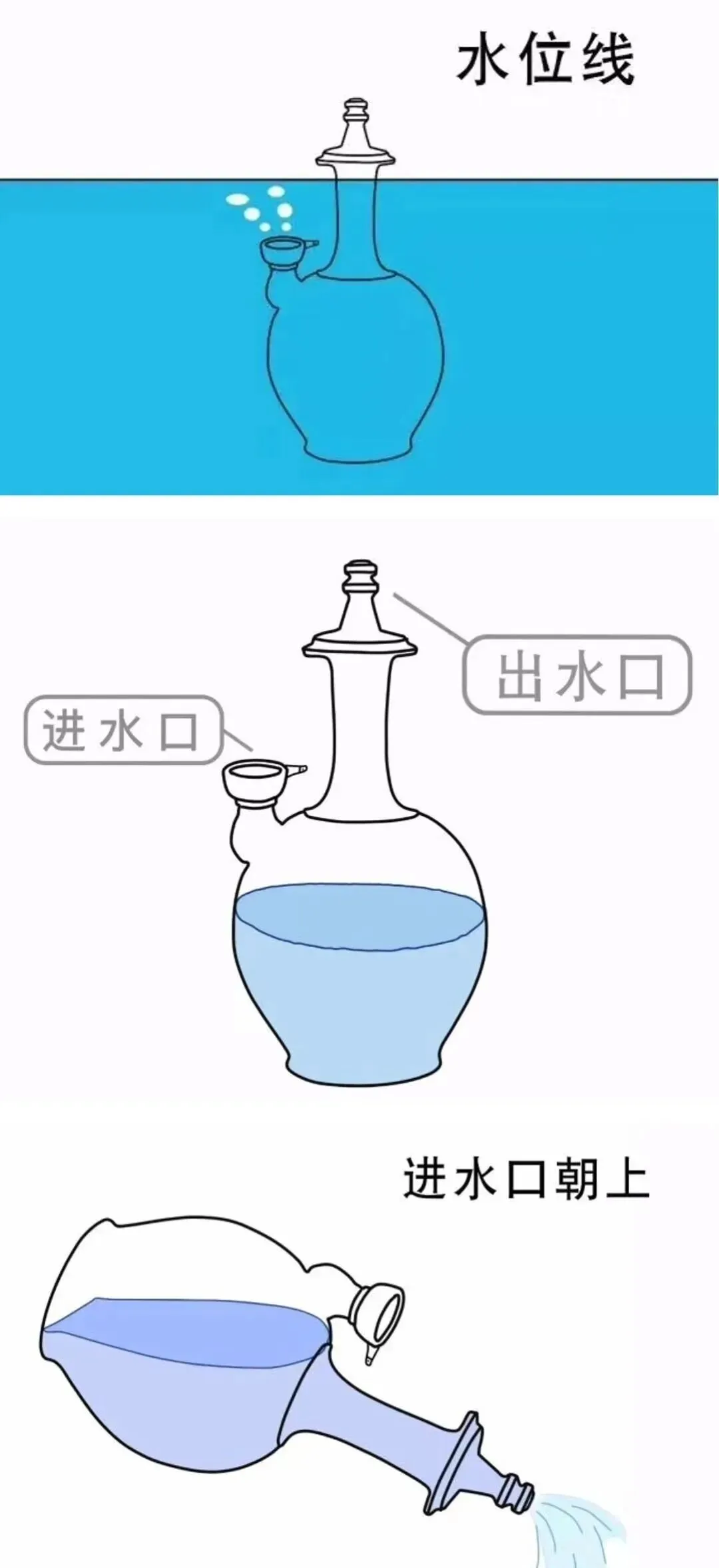 净瓶最典型的形制为双口设计:顶部细长颈为出水口,用于饮水;肩部另设一短颈为注水口,防止手触污染水源,体现佛教“护净”理念 。根据材质不同,瓦瓷制净瓶用于盛净水饮用,铜铁制品则多用于洗手,称为“触瓶” 。