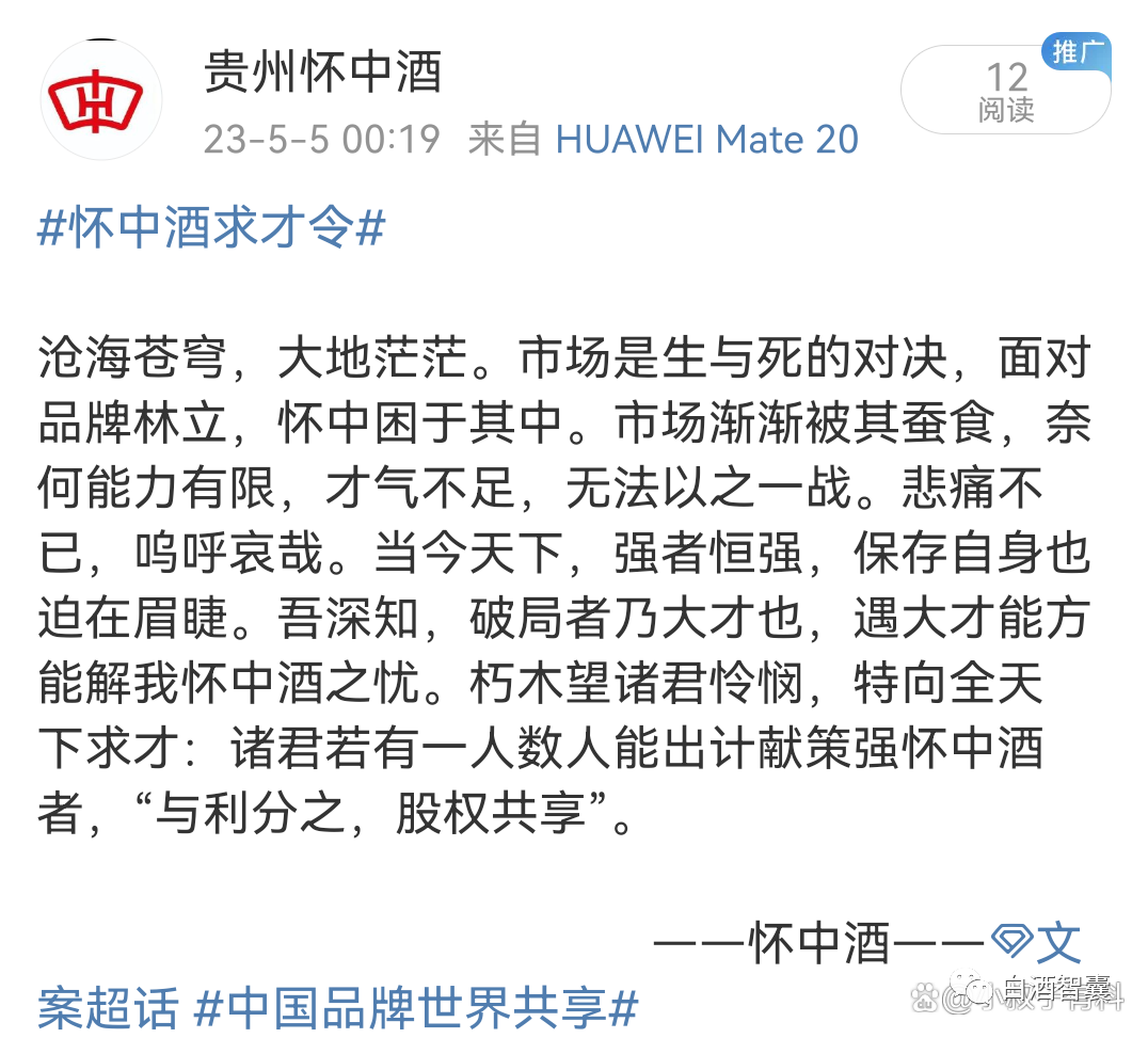 一看,这个文章写得不耐,还是有点墨水的。他内容一开始分析酒品牌太多,自己市场很惨。后面接着写自己可怜,无奈无助感。最后抛出橄榄枝,愿与天下士子共享果实。这个不就是仿效当年秦穆公发求贤令吗?不由得心中然生好感,不为是一种不是办法的办法,惊叹世间聪明人好多。
