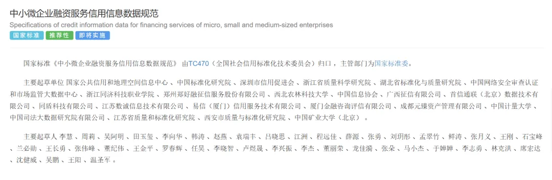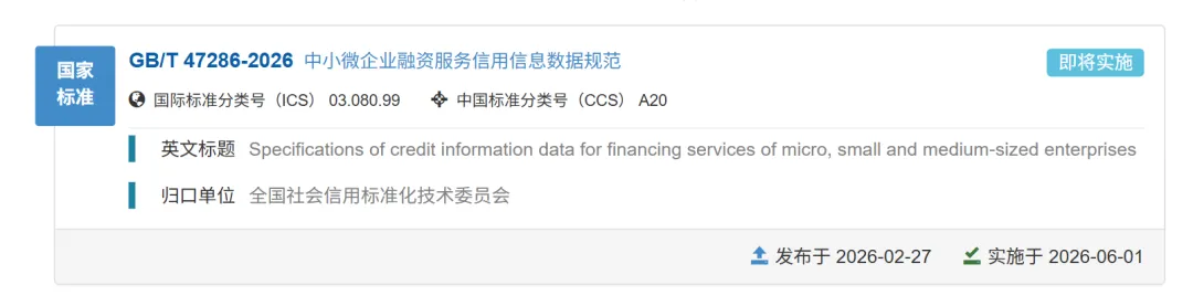 近日,由广西征信有限公司参与起草的国家标准《中小微企业融资服务信用信息数据规范》(GB/T 47286—2026)正式通过国家标准化管理委员会公示,将于2026年6月1日起实施。