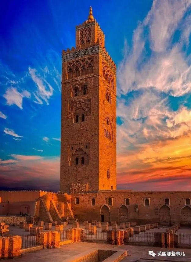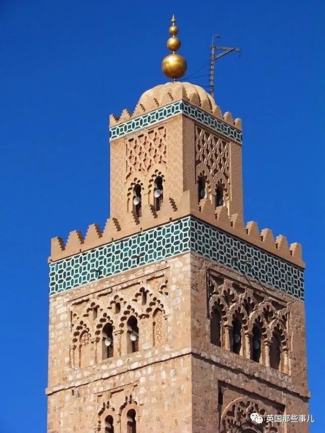 摩洛哥马拉喀什市库图比亚清真寺,是该市的地标和象征,始建于1147年,宣礼塔高77米,上面有很多独特的拱形结构。
