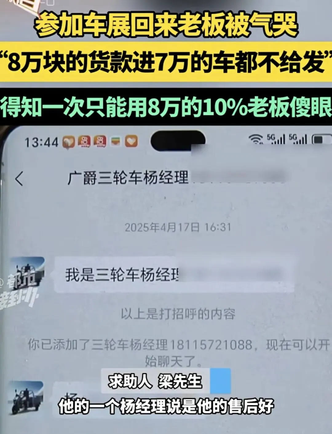 去年4月,这位有着20多年电动车行业经验的经销商,在丰县电动车展会上被一家名为“广爵三轮车”的厂家吸引,随后双方签订了合作协议。本以为是一次正常的商业合作,可回来仔细研究合同后,经销商傻眼了。合同中存在明显的文字游戏陷阱:8万元的货款,厂家竟连7万元的车都不给发,每次提货只能使用8万元的10%;而且这8万元的订金,最少得进80万的货才能用完,这相当于经销商用8万元购买了一堆有高门槛的“优惠券”,实际使用起来困难重重。