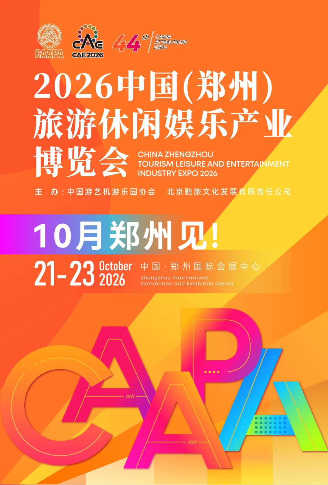 第44届CAAPA游乐设施设备博览会-2026中国(郑州)旅游休闲娱乐产业博览会将于2026年10月21-23日在郑州国际会展中心举办,规模超4.5万平米,预计参展企业500余家、专业买家5万人。中国国际游乐设施设备博览会(CAE)已成功举办43届,是中国游艺机游乐园协会(CAAPA)打造的品牌活动,每年吸引来自全球40多个国家和地区的10余万专业买家前往参观和采购,是国际旅游行业最具口碑和影响力的专业品牌展之一。