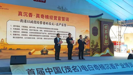 在博览会开幕式上,电白区沉香联合会会长谢利发、电白区沉香协会会长汪科元、电白区沉香商会会长温全君,面向社会各界庄严宣誓:坚守底线,只售真品,绝不售卖假冒伪劣沉香;杜绝造假,恪守本真,坚决不做注油、染色等造假行为;诚信为本,透明经营,主动告知产品关键信息;敬畏市场,承担责任,接受监督,维护消费者权益。铿锵有力的誓言,展现了电白沉香人坚守品质、诚信经营的坚定决心,也彰显了本届博览会推动行业健康发展的坚定信念。