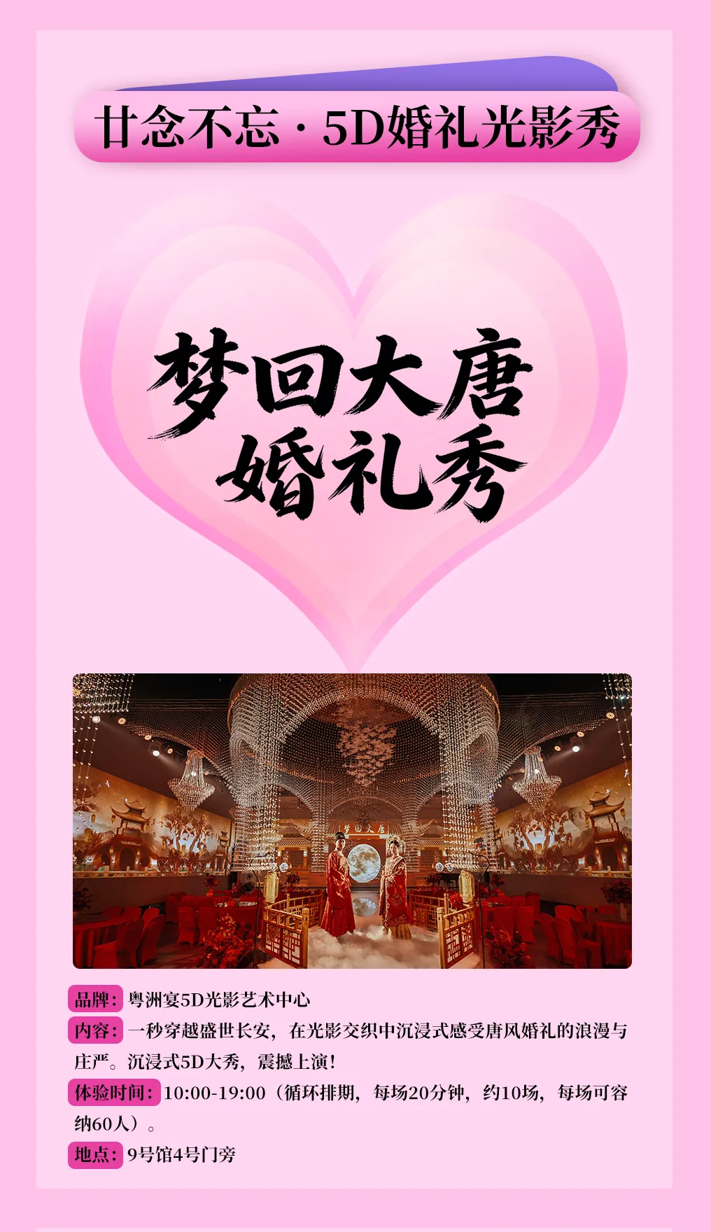 粤洲宴5D光影艺术中心带来沉浸式5D大秀。20分钟一场,循环排期。走进光影,一秒回到盛世长安,感受东方浪漫。每场仅限60人,记得早点去。