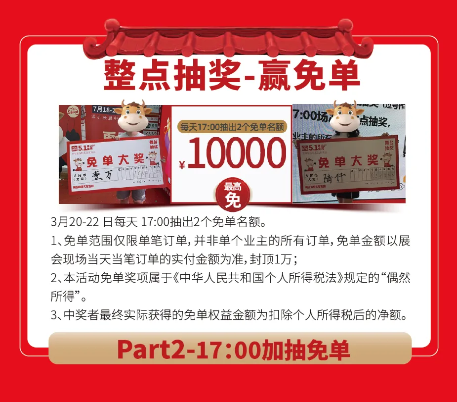 单笔订单实付满1000元,可凭抽奖券于13:00、15:00、17:00到舞台进行抽奖。品质家居、品牌家具、不定额现金红包等你来拿!