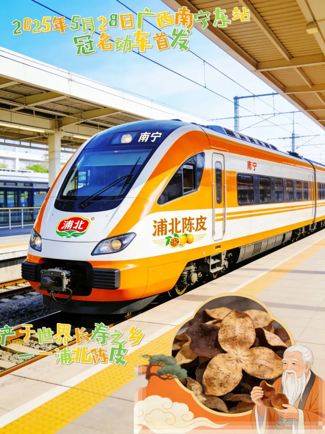 2025年5月28日,浦北陈皮冠名高铁在南宁东站正式首发,一列满载着长寿乡香气的列车,驰骋大江南北,让全国人民都看见浦北、记住浦北。