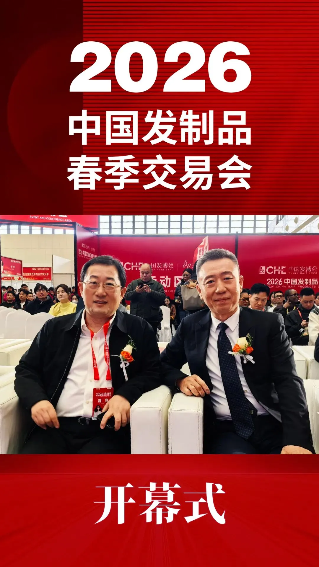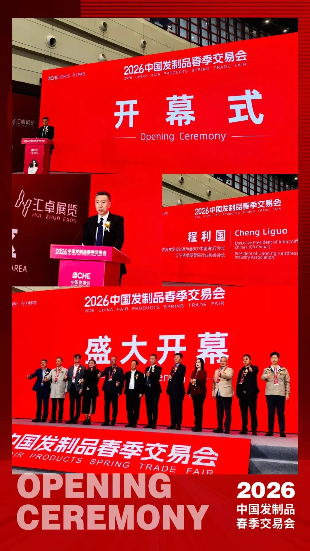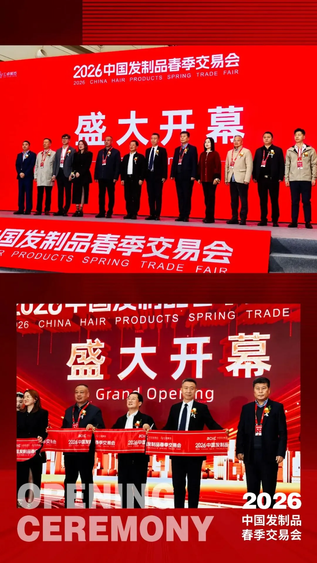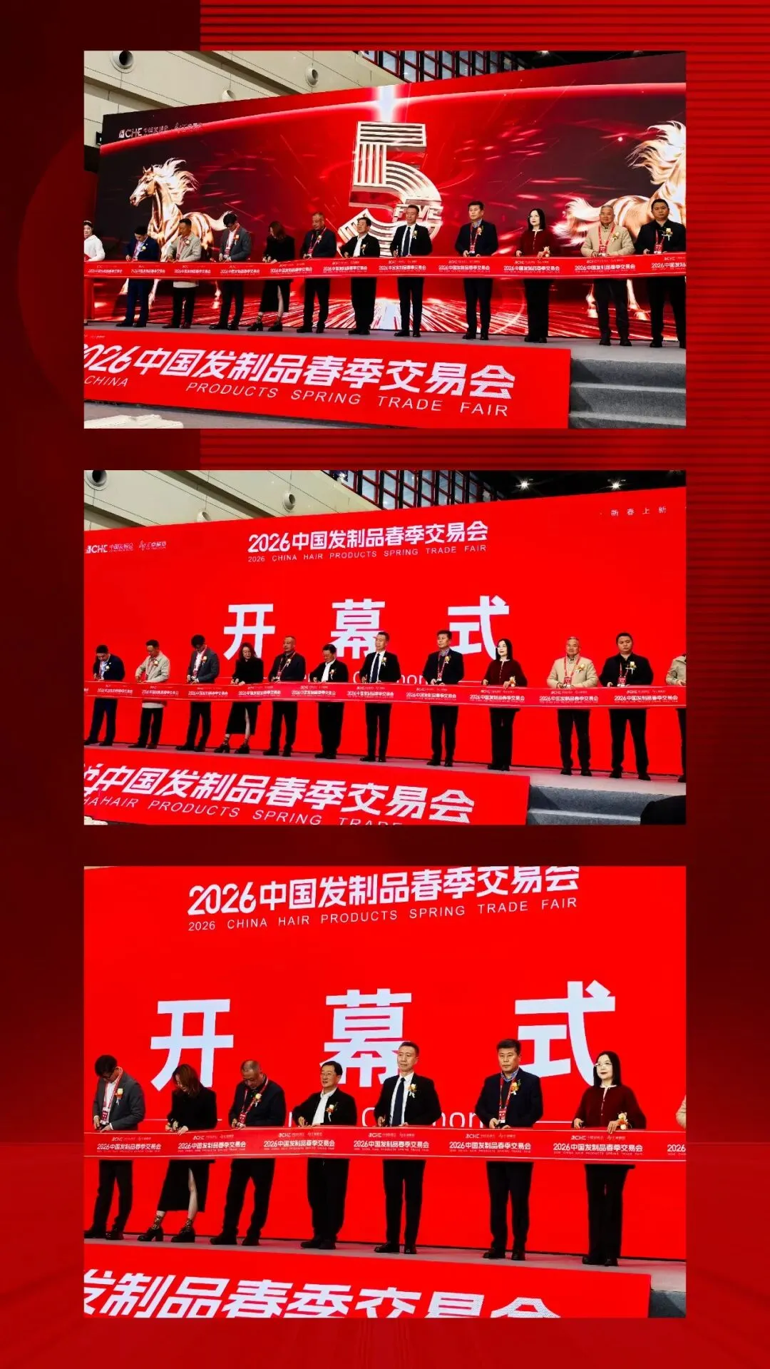 随着红色主视觉大屏上“盛大开幕”字样点亮,各位领导嘉宾共同剪彩,2026中国发制品春季交易会正式拉开帷幕。