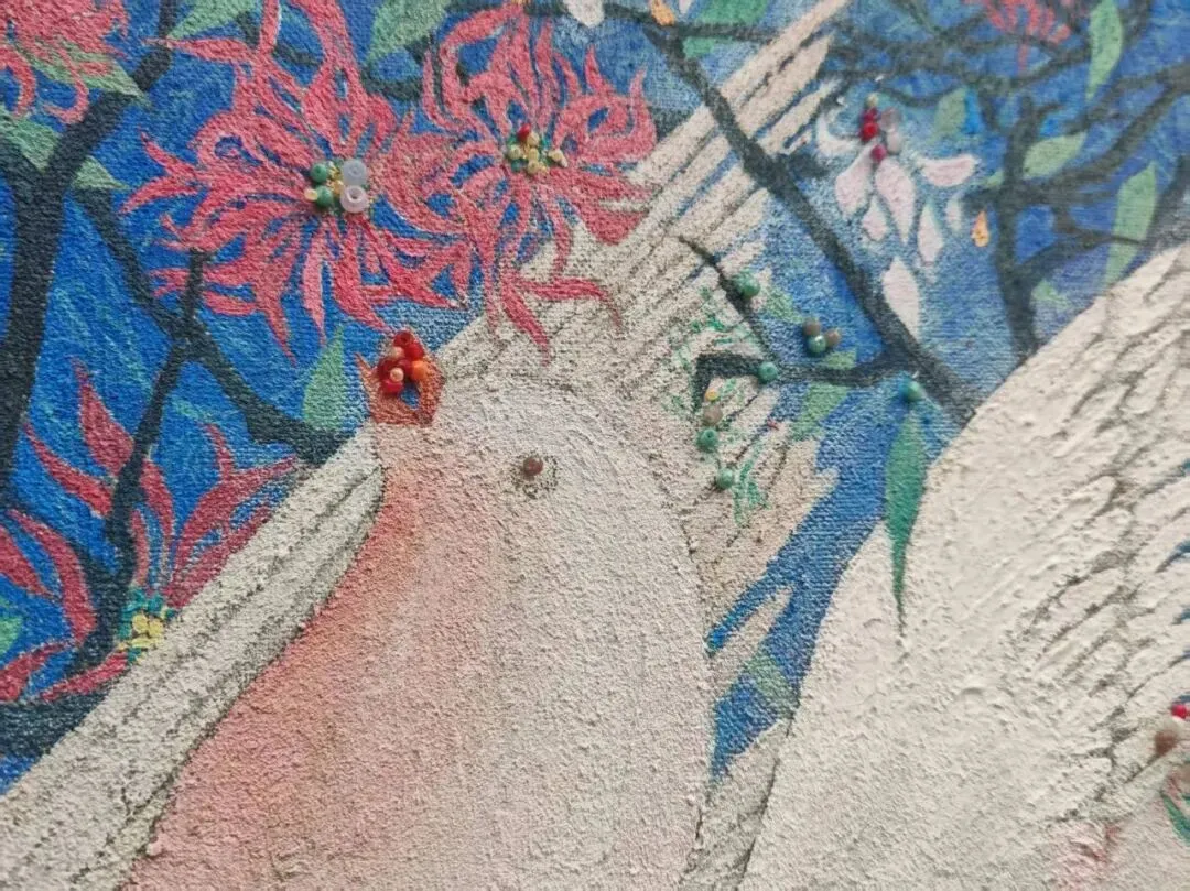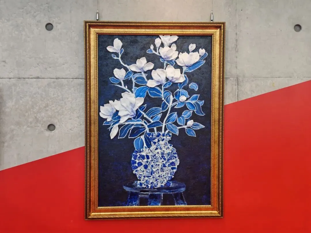 作品以深蓝石英砂铺陈静谧底色,超轻粘土雕琢玉兰花瓣,层叠间尽显温润雅致;青花碎片拼贴成瓶,碎瓷纹理与青花古韵相融。立体肌理碰撞东方美学,于静谧蓝调中绽放玉兰清韵,尽显传统与现代的诗意交融。