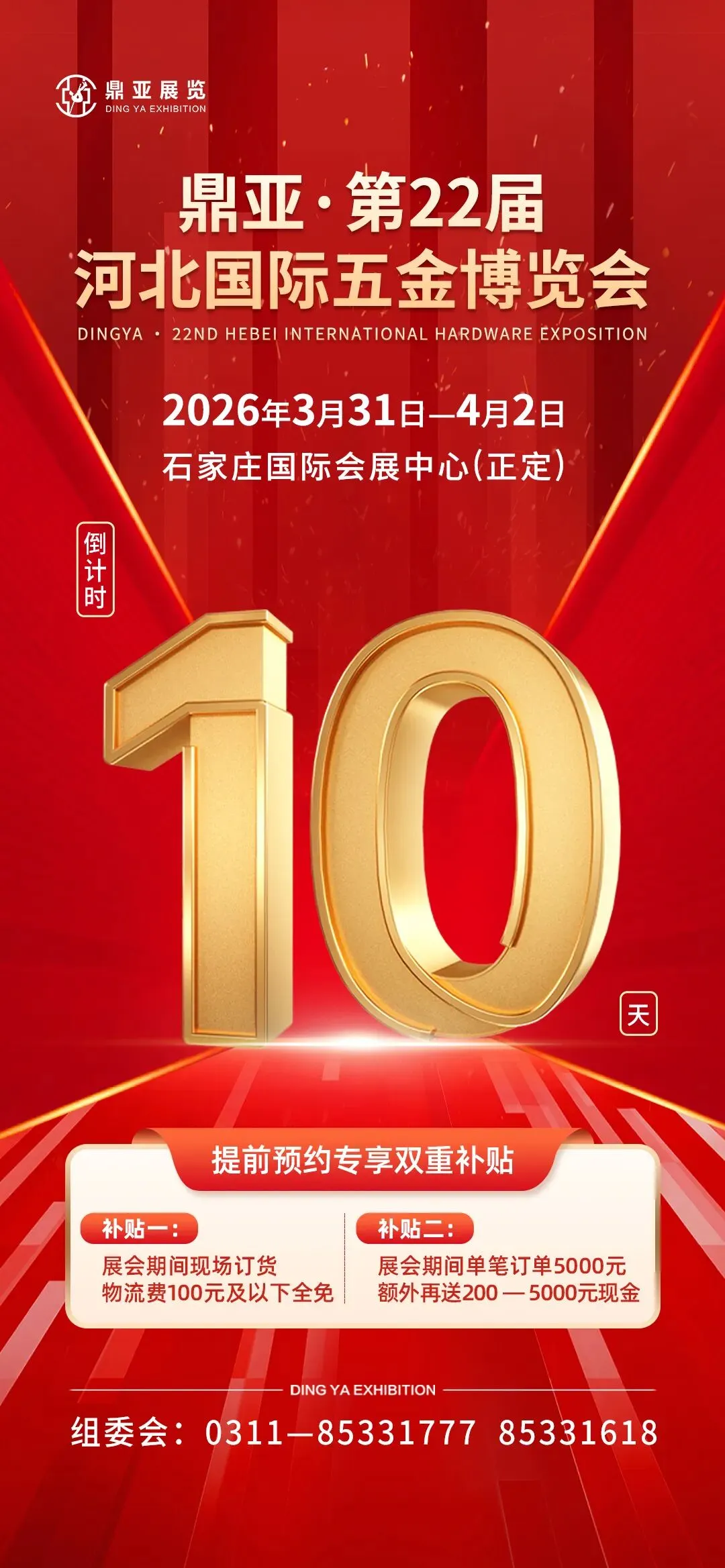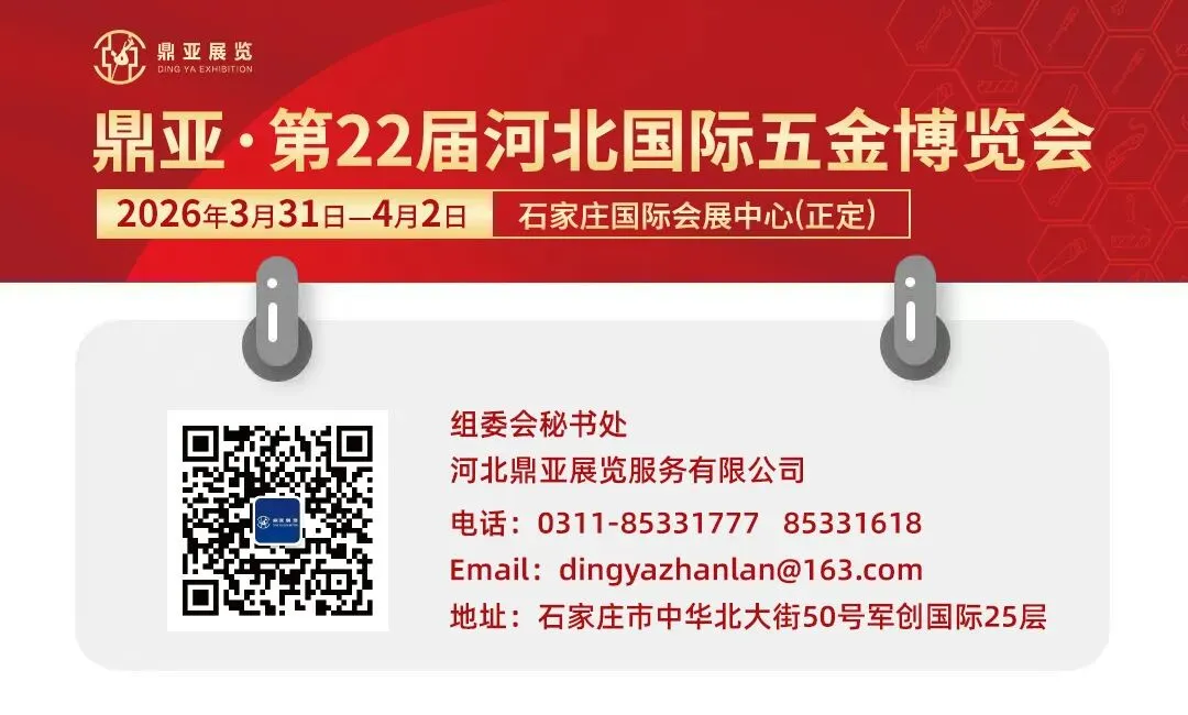 鼎亚·第22届河北国际五金博览会将于2026年3月31日—4月2日,在石家庄国际会展中心(正定新区)盛大启幕!作为华北颇具规模影响力盛会。是集展览展示、高峰论坛、技术交流、贸易合作为一体,展示业界新技术、新设备,探讨业界发展新趋势、新动向,为生产商、经销商和终端用户搭建权威专业的商贸平台,进一步促进华北五金与全国各地及国际间的交流合作,推动北方五金行业创新发展。