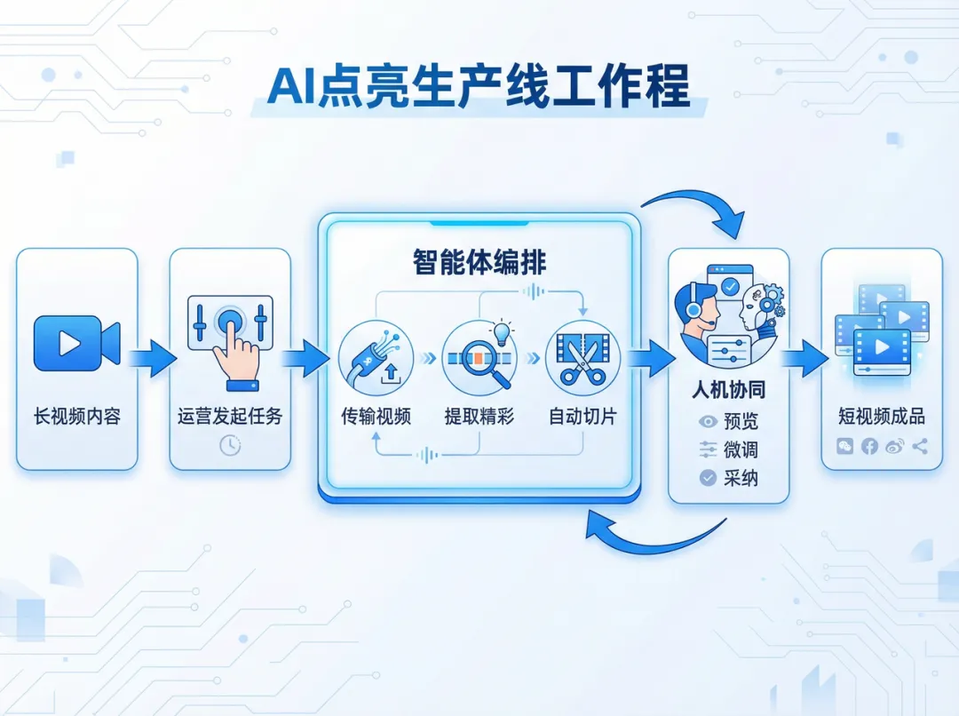 即使有了AI识别出的精彩片段“打点信息”(如第120秒到220秒为高潮),运营人员仍需要手动切片、转码、上传,流程冗长。AI能力如果不能无缝嵌入现有的“选片-剪辑-发布”业务流程,就只是一个“半成品工具”,难以真正落地。