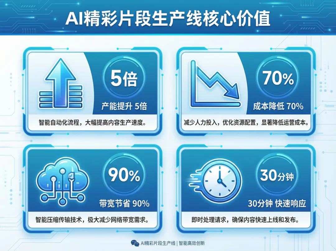 AI不再是孤立的工具,而是深度嵌入业务生产流程的关键引擎。本次“AI精彩片段”智能运营系统的成功交付,标志着AI技术与内容生产业务的首次深度融合落地,真正实现了从“人工劳动”到“智能生产”的价值跃迁。