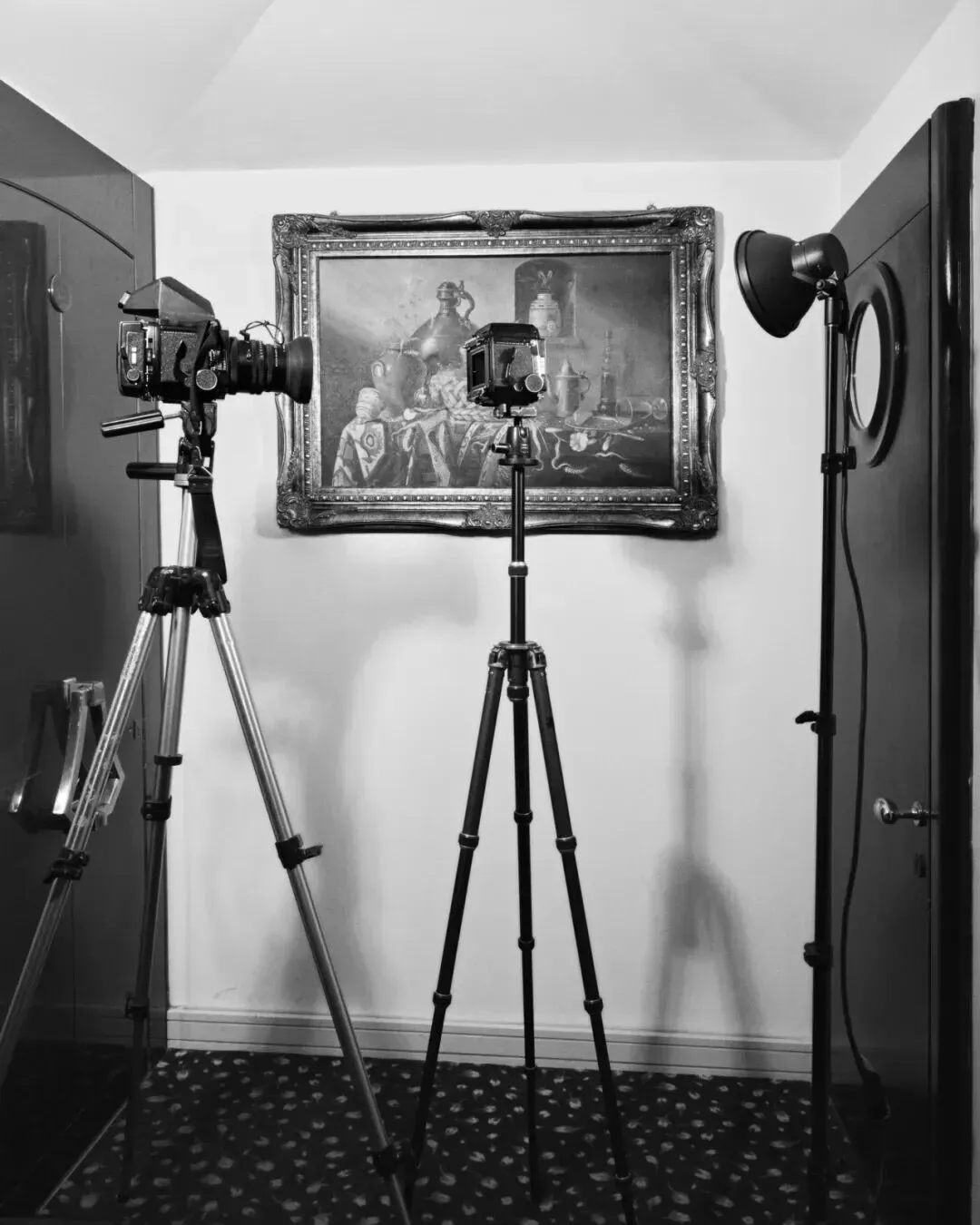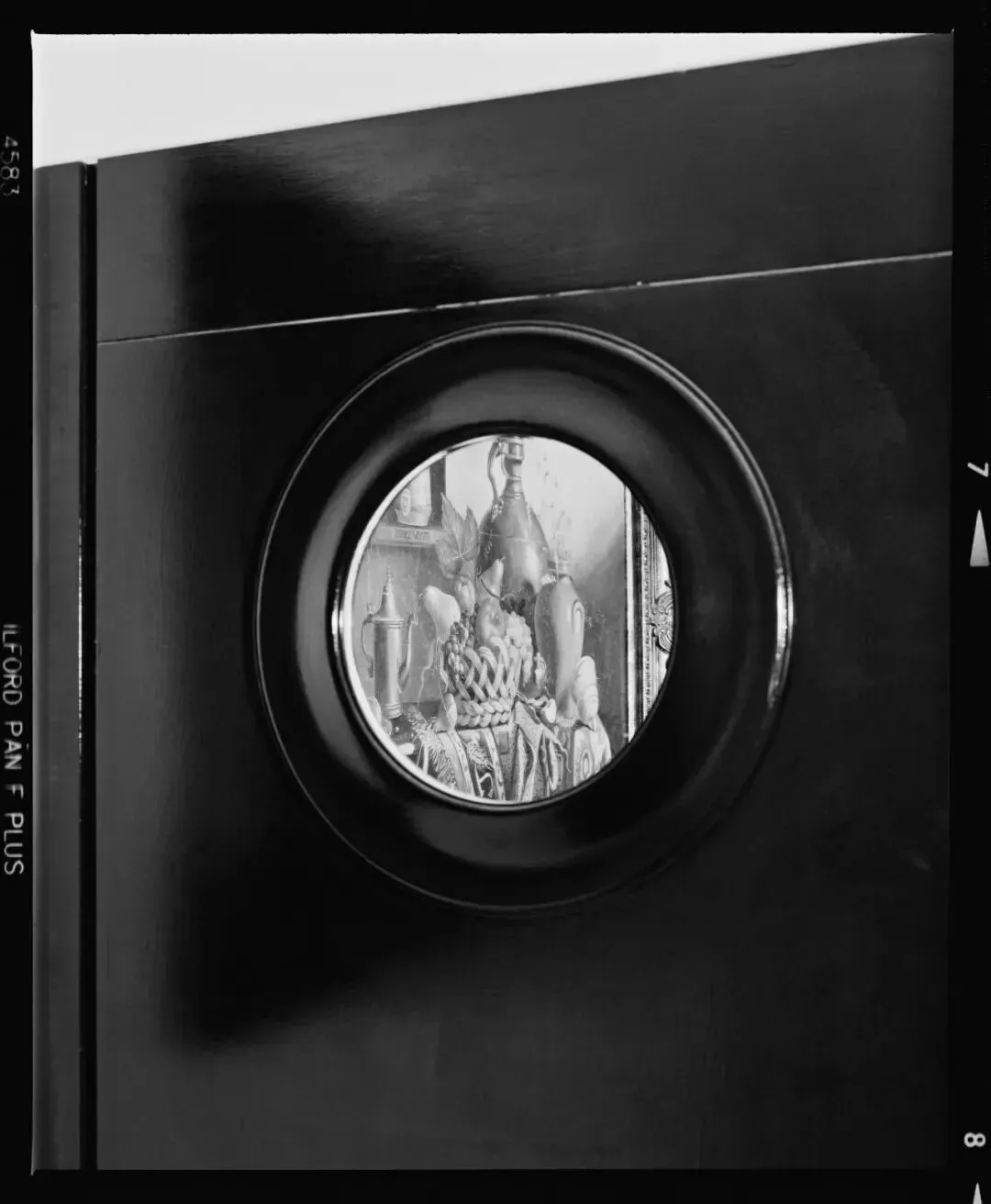 镜子中反射的绘画,其倒影延续在上过漆的黑色门板上,这是一种非常摄影化的效果,揭示了一种真正的摄影美学。这张照片周围的底片边框增加了另一层再现:从绘画到画框,到底片框,再到照片框。