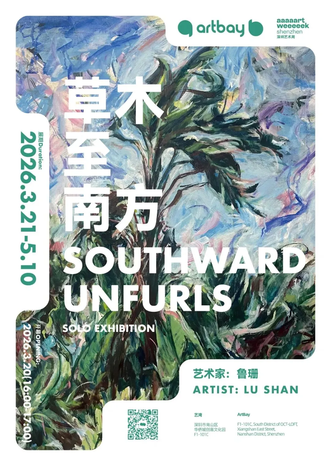 2026 年3月20日,适逢春分节气,艺湾 ArtBay 主办的鲁珊个展「草木至南方」正式开幕。展览展出艺术家最新创作的25件绘画作品。鲁珊以中原、南方、青藏高原三地草木为创作脉络,在三地间穿梭探寻生命与归属。她从四季轮回中汲取诗意,在南方繁茂生机里体悟生生不息的力量,于高原藏地感受精神向往。展览以自然为媒介,呈现艺术家对时间、生命与归属的诗意思考,亦是艺湾 ArtBay 对本土艺术持续关注与支持的呈现。