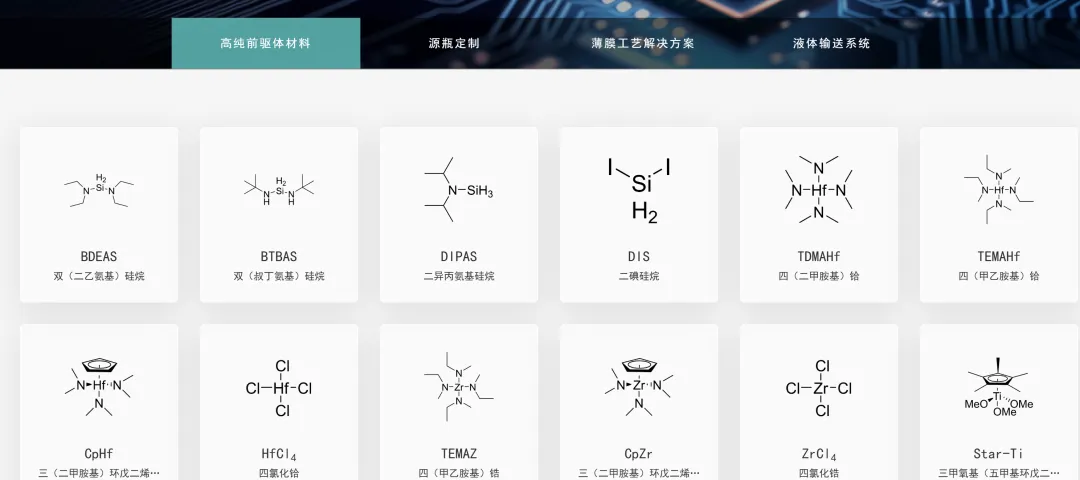 1、高纯前驱体材料:覆盖高纯硅基前驱体、High-K前驱体、金属及导电薄膜前驱体、钙钛矿光伏前驱体,应用于半导体、新能源等领域;