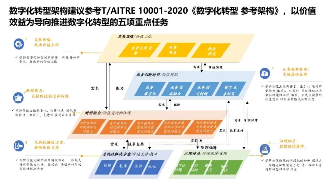 文档引用了 T/AITRE 10001-2020《数字化转型 参考架构》,提出了以价值效益为导向的五项重点任务: