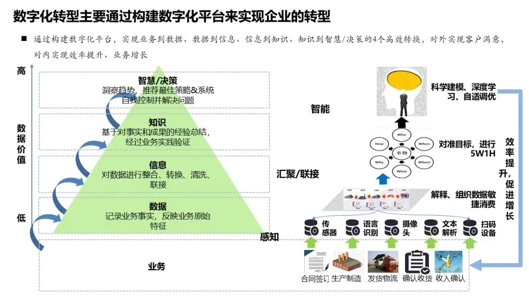 数字化转型主要通过构建数字化平台(如中台)来实现从业务到数据、数据到信息、信息到知识、知识到智慧/决策的四个高效转换,对外实现客户满意,对内实现效率提升与业务增长。