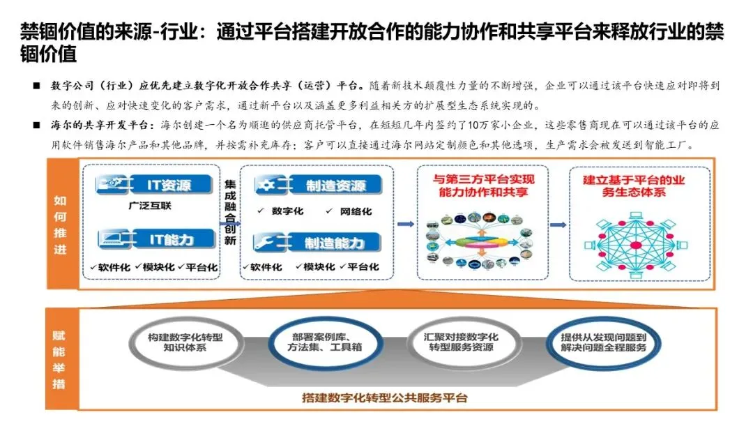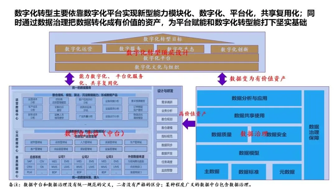 平台化是实施路径:通过数字化平台(中台)实现能力的模块化、服务化、共享化;