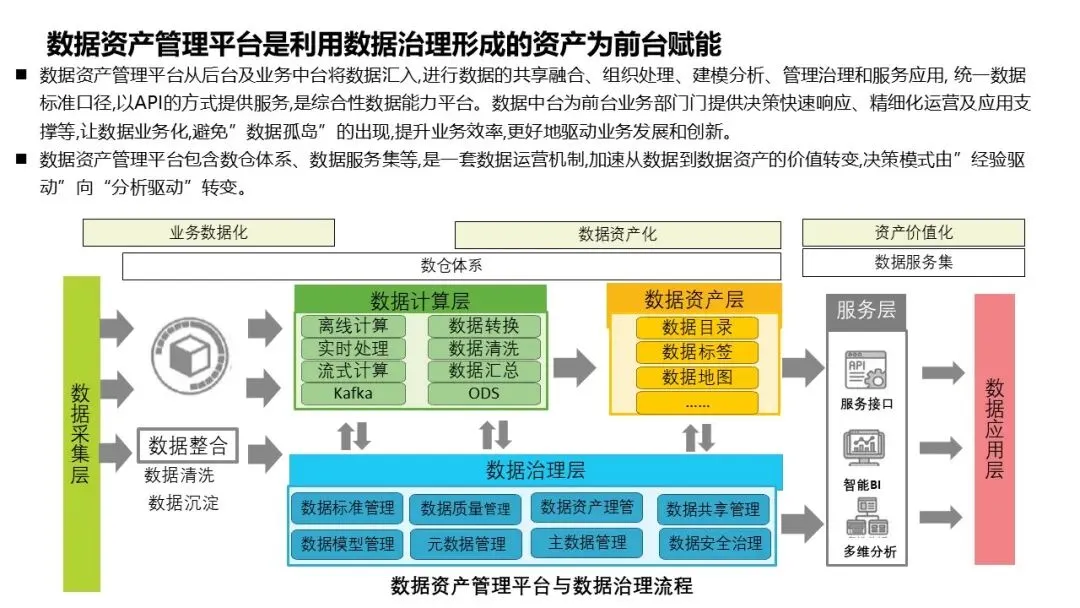 它从后台及业务中台汇入数据,进行共享融合、建模分析、管理治理;