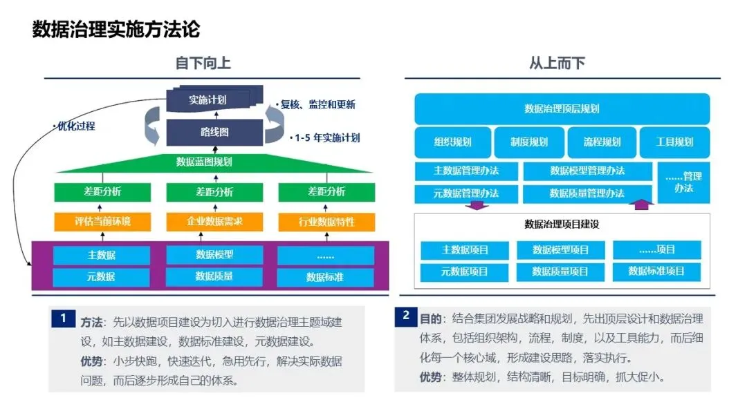 自上而下:先做顶层设计,构建治理体系(组织、制度、流程、工具),再细化各核心域;