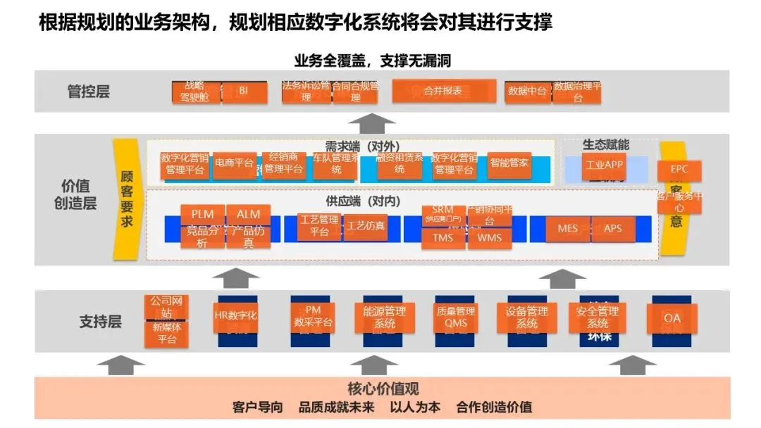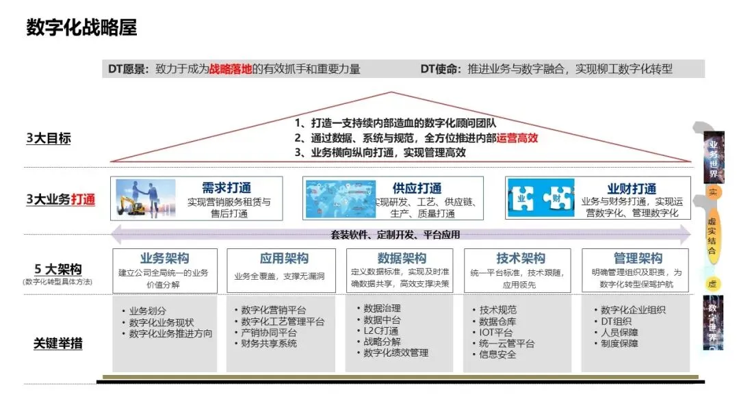 构建数字化战略屋,涵盖价值创造层、支持层、管控层;