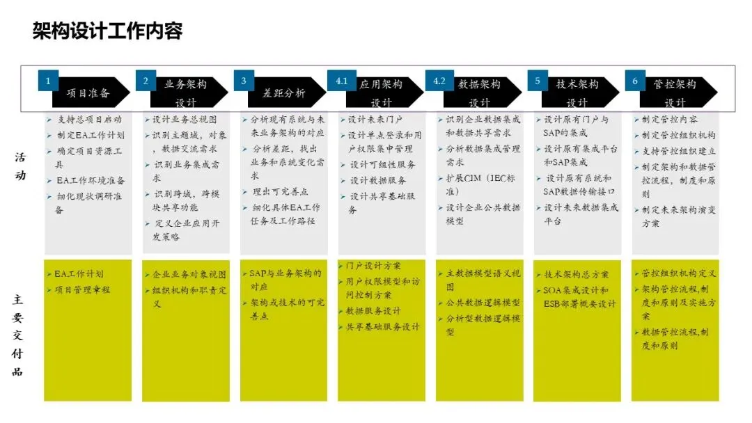 交付内容包括业务架构、数据架构、应用架构、技术架构、管控架构;