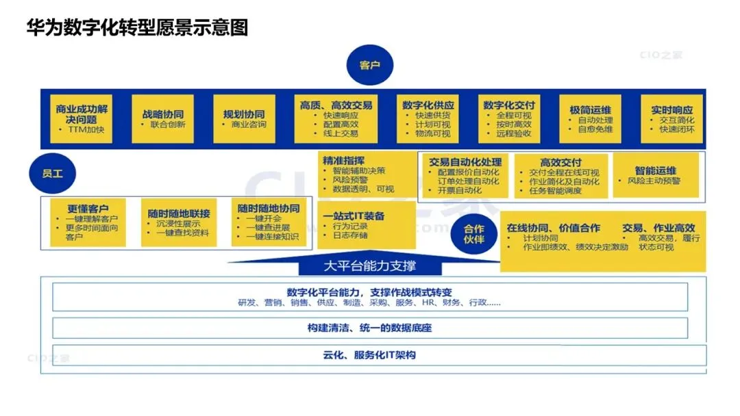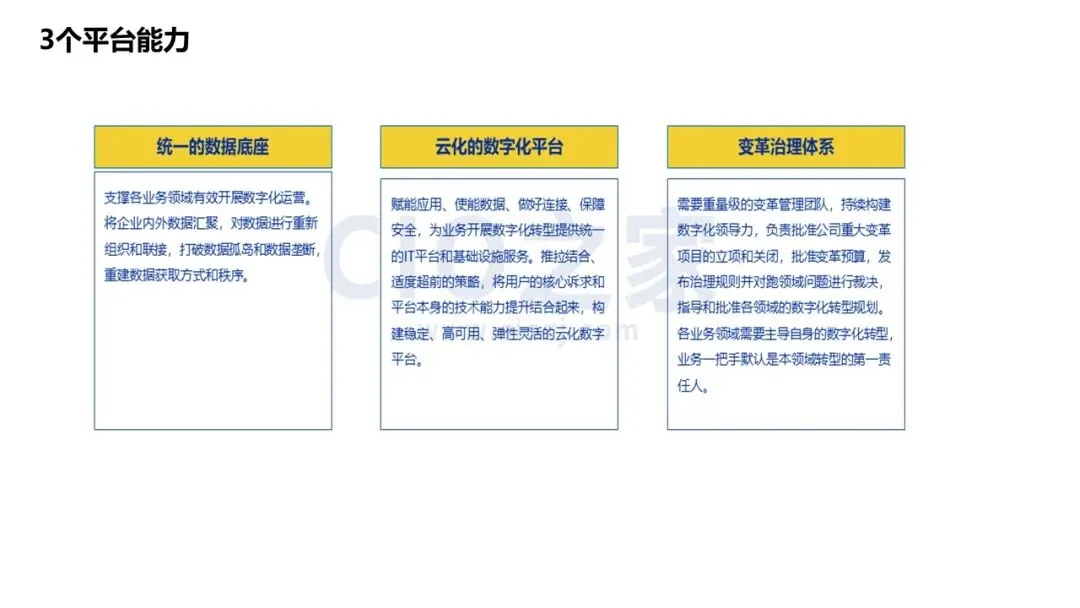 组织与文化是基础:数字化转型需要“一把手工程”、业务与IT一体化团队、平台共享文化、数据驱动决策;