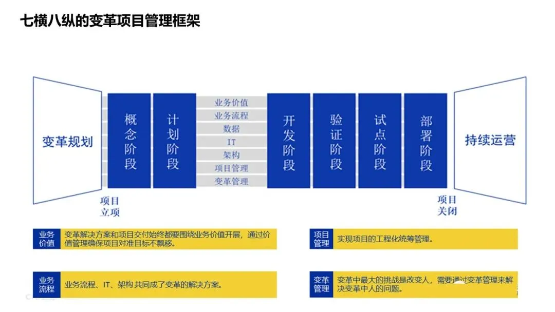 七横八纵变革项目管理框架:覆盖组织、流程、数据、技术等维度;