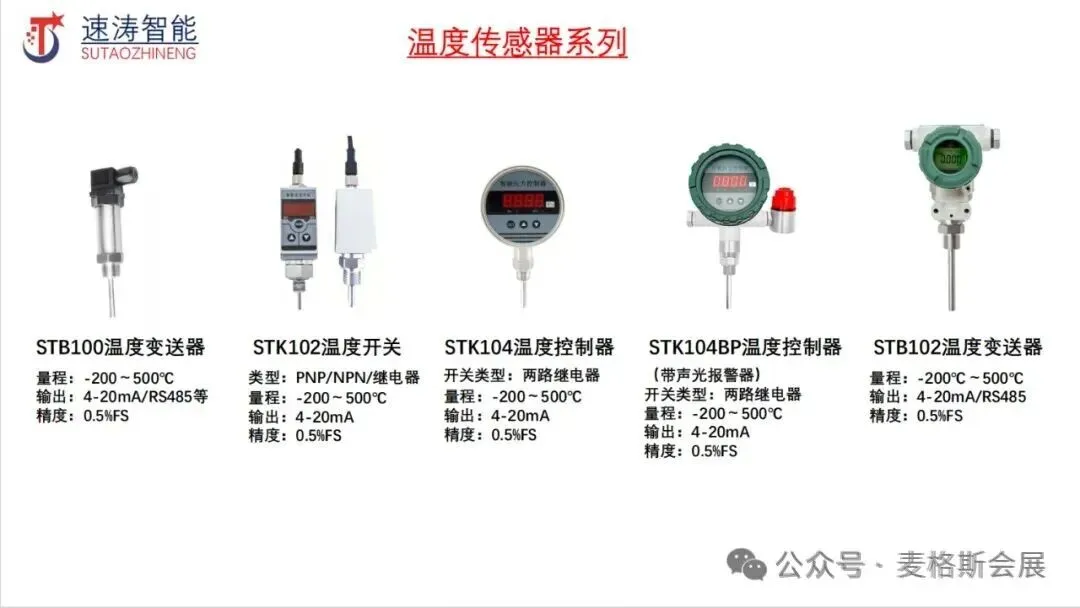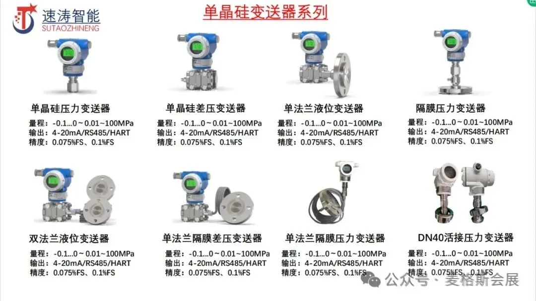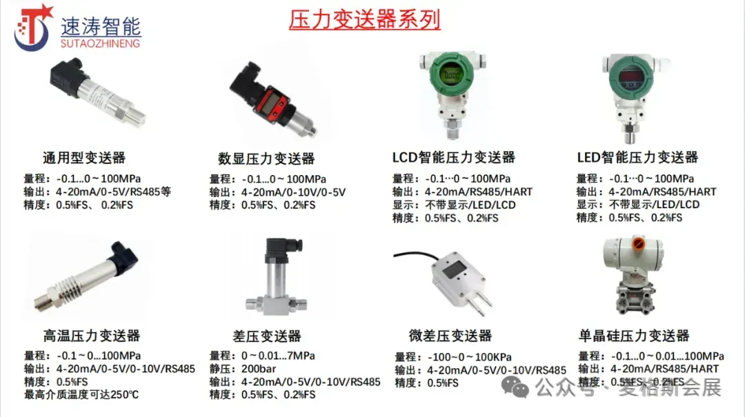 公司主营产品:差压传感器,压力变送器,液位变送器,温度传感器,电磁流量计,涡街流量计、 压力开关、超声波流量计、液位传感器、液位计、质量流量计、流量开关、涡轮流量计、雷达液位 计、双金属温度计、蒸汽流量计、雷达物位计、气体流量计、液位开关、液位控制器、水位计、压力控制器、压阻式压力传感器、科里奥利质量流量计、水流量计、污水流量计、气体压力传感器、 高精度压力传感器、智能电磁流量计、数字压力传感器、智能压力变送器、差压开关等产品。速涛传感为全球100多个国家和地区的客户,提供流体介质测量的特定产品解决方案。