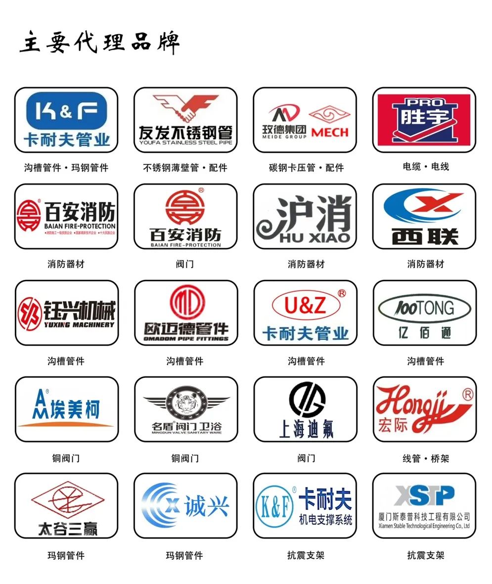 公司是山西卡耐夫、福建百安消防、友发不锈钢、 山东钰兴、名盾阀门、潍坊欧迈德、福建西联、宁波埃美柯、山西三赢等公司的指定代理商。