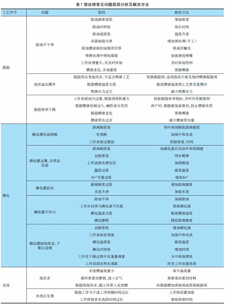摘要:介绍了家电粉末涂装生产线的平面布局、工艺流程、设备配置和前处理参数控制要求,以及成本的概算,对家电行业粉末涂装线的建设具有指导意义。家电行业是我国粉末涂料最大的应用领域,粉末涂装技术相对比较成熟。家电粉末涂装生产线由4大主要设备单元构成,包括前处理设备、水分烘干设备、喷粉设备及粉末固化设备。(5)工件多为冷板,锈蚀较轻,不需要在线设置除锈工序;(6)生产线相对简单,管理维护相对容易。1、主要设备及工艺参数1.1.1 目的及作用涂装前处理的目的在于去除工件上的油污、氧化皮及尘土等污物,以提供适合涂装的良好基底。其作用主要体现在以下几个方面:(1) 增强涂膜对被涂物表面的附着力;(2) 提高涂膜对被涂物的保护性能;(3) 为涂膜提供平整良好的基底表面。1.1.2 前处理形式前处理可分为机械和化学处理,机械处理有:喷砂,抛丸;化学处理有:槽浸式、喷淋式。1.1.3 前处理工艺过程及典型工艺(5)与后道工序的配套性。前处理主要过程包括脱脂、水洗、表调、磷化、水洗、去离子水洗等工序。根据工件不同、产品不同以及前述5个因素的变化可进行增减。家电行业的板材一般为冷板,油污较少,脱脂工序一般设置两道,以锌系磷化为主,目前也有采用硅烷处理工艺的。家电粉末涂装典型的前处理工艺如下:(1)饮水机壳体的涂装前处理工艺热水洗(30s,50~65℃ ) → 预脱脂(60s,50~65℃) →脱脂(150s,50~65℃) →水洗1(直排)→水洗1[30s,室温(RT)]→水洗2(30s,RT) →新鲜水直喷→表调(30s,RT) →磷化(150s,50~60℃) →水洗3(30s,RT) →水洗4(30s,RT) →新鲜纯水直喷。(2)空调器壳体涂装前处理工艺热水洗(40s,50~65℃ ) →预脱脂(80s,50~65℃ ) →脱脂(120s,50~65℃ ) →水洗1(45s,RT) →水洗2(50s,RT) →新鲜水直喷→表调(45s,RT) →磷化(150s,38~45℃) →水洗3(45s,RT) →水洗4(50s,RT) →纯水洗(50s,RT) →新鲜纯水直喷。(3)一种特殊的涂装前处理工艺脱脂磷化(90s,120~140℃ ) →水洗1(60s,120~140℃ ) →纯水喷(5s,RT) →水洗2(60s,RT) →纯水喷(5s,RT)1.1.4 前处理设备设计及平面布局家电粉末涂装生产线前处理多采用喷淋式结构,主要设备包括通道、液槽、喷淋管路、换热管路及排风系统等,见图1。通道结构:常用钢板焊接,内部设置挡板隔断,防止液体飞溅,应有足够的过渡区防止窜液,并设置维修通道,利于更换内部喷嘴及清理通道内部积存污物。有些通道不通焊,而用折弯、咬口、打胶等方法代替,以节省现场焊接工作量。通道长度L = 进出口长度+喷淋区长度+过渡段长度进出口长度主要根据工件长度、喷淋飞溅长度及热蒸汽外溢的状况确定;过渡段长度由工件长度、滴水时间、喷淋飞溅长度确定;宽度B由工件的宽度F决定,并需要考虑喷淋管路的安装距离。高度H由工件的高度E 决定,同时考虑喷淋管路的安装方法,当喷淋主管安装在顶部或底部时应考虑不同的安装余量。①过渡段长度合适,前后沥液区设置合理,不出现窜液现象;②适当开门,利于观察脱脂及磷化效果,但不能影响产品质量;③合适的进出口长度,既防止喷淋液溅出设备外又不浪费材料;长宽高根据隧道尺寸、操作面要求、泵安装形式等决定;泵进口应有过滤装置,防止泵堵塞,加热热源可以选择蒸汽、电及天然气。③为节约水的消耗量,水洗槽应能满足逆流补水的要求;④槽内加热器设计合理,除满足升温要求外还应考虑安装维修等其他要求。喷嘴的多少由工件的高度及喷淋要求所决定,底喷嘴根据工件形状可有可无,喷嘴间距是由喷嘴的喷淋角度决定的。喷嘴通常有V型、空心锥形,可根据情况选用。喷淋泵的流量是由喷嘴总量决定的,喷淋压力由工艺要求及管道损失计算得到。喷淋管路的走向根据客户的喜好和习惯决定,可选择上行或者下行方式,各有利弊。磷化喷淋管应采用快拆式结构。喷淋泵形式有卧式和立式,建议磷化工位选择立式泵,其他工位可随意选用。排风系统的作用是防止喷射区的槽液蒸汽扩散到车间;通风机排风量根据开口处混合气体溢出量来决定,风机的风压由风道阻力决定;设计排风系统的关键点是不得将液体抽出排掉。决定涂装前处理平面布局的因素是设备大小、物流走向、厂房面积。前处理重要工序包括脱脂、表调、磷化,其工艺参数控制至关重要。脱脂机理是通过脱脂剂对各类油脂的皂化、加溶、润湿、分散、乳化等作用,从而使油脂从工件表面脱离,变成可溶性的物质或被乳化、分散而均匀稳定地存在于槽液内。脱脂质量的评价标准为脱脂后的工件表面不能有目视油脂、乳浊液等污物,水洗后表面应被水完全润湿。脱脂质量的好坏主要取决于游离碱度(FAL)、总碱度(TAL)、脱脂液的温度、处理时间、机械作用和脱脂液含油量等因素。表面调整剂可以消除工件表面因碱液除油或酸洗除锈所造成的表面状态的不均匀性,使金属表面形成大量的极细的结晶中心,从而加快磷化反应的速度,有利于磷化膜的形成。表调工序控制的主要参数为压力、pH值(8~9),表调液浓度一般控制在0.2%~0.3%,配槽水电导率不能太高,一般<200μS/cm 。表调液的消耗量控制在0.5~2g/m2,需要定期更换(一周左右)。磷化是一种化学与电化学反应形成磷酸盐化学转化膜的过程,所形成的磷酸盐化学转化膜称之为磷化膜。磷化是整个前处理工艺最为重要的一个环节,其反应机理复杂且影响因素较多,因此磷化槽液相对于其他槽液的控制要复杂得