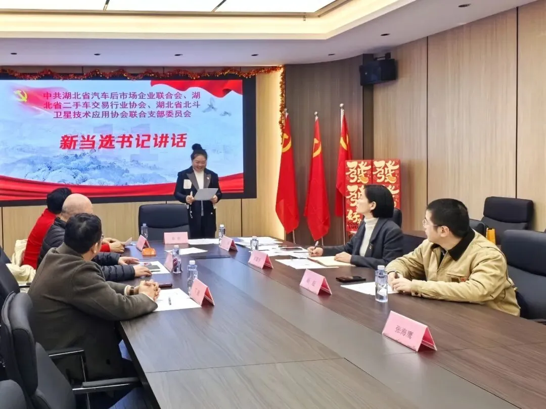 新当选的支部书记代表第一届联合党支部委员会作表态发言。发言中,新当选书记王燕同志表示,联合党支部的成立是三家协会党建工作的重要里程碑,今后将在上级党委的坚强领导下,团结带领全体党员,充分发挥党支部的战斗堡垒作用和党员的先锋模范作用,推动三家协会在党建引领下实现资源共享、优势互补、协同发展。同时,将紧紧围绕行业发展的实际需求,扎实做好服务会员、服务行业、服务社会各项工作,为湖北省汽车后市场、二手车流通和北斗技术应用领域的高质量发展贡献力量。