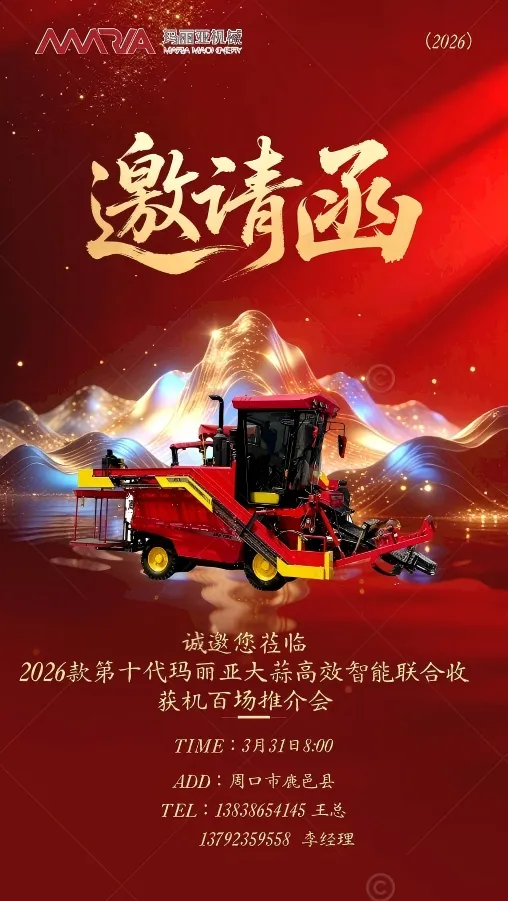 赢未来,势不可挡!2026年新款第十代玛丽亚大蒜高效智能联合收获机百场推介会火热进行中!3月31日,我们将走进周口市鹿邑县,诚邀广大蒜农朋友、农机经销商莅临现场,共同品鉴新品、共话丰收!