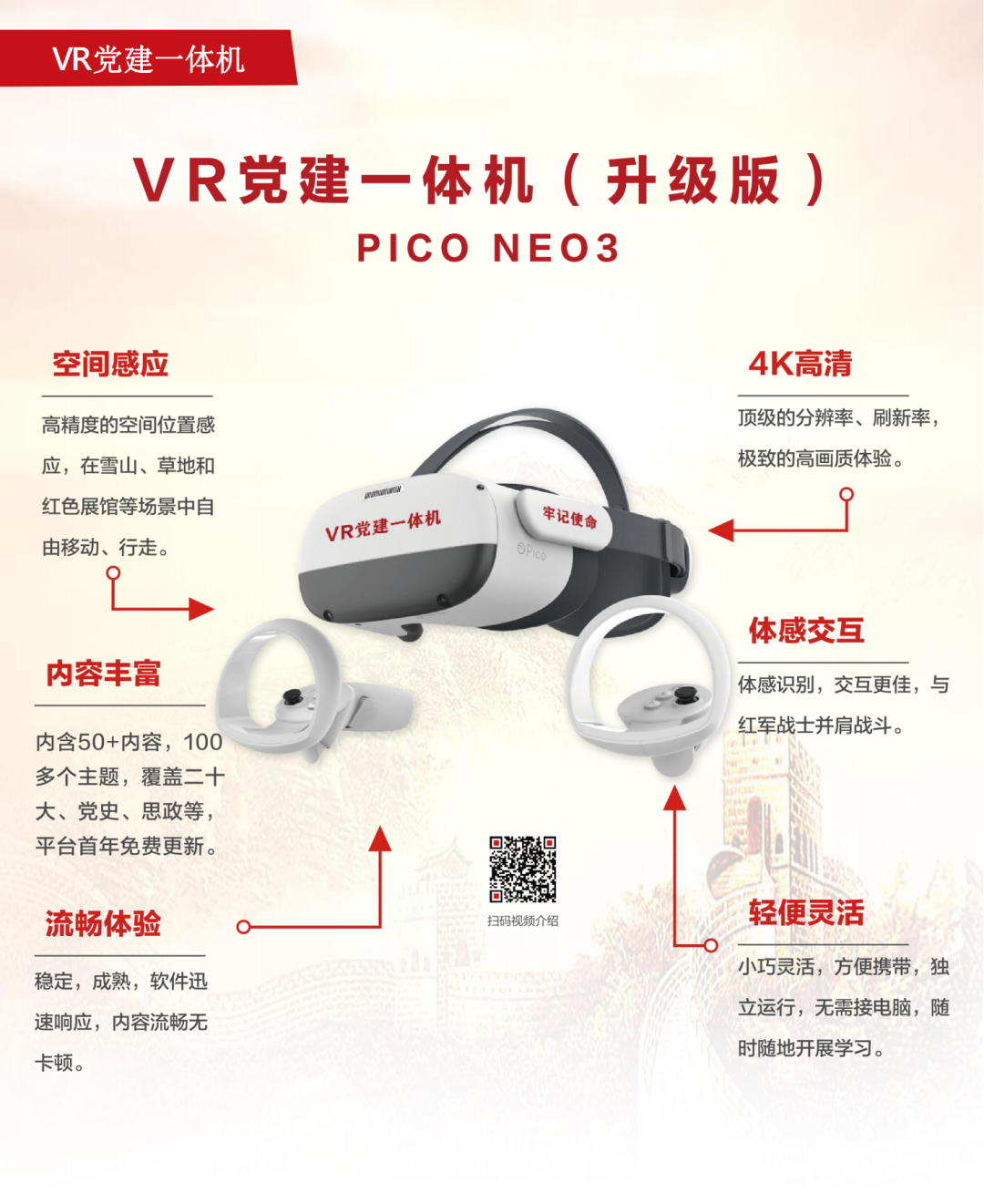 把VR融入到党建教育之中,是通过虚拟现实技术,以更加立体、沉浸的学习方式,为党建教育赋能,助力党建教育提高效率,增强吸引力。在VR所打造的虚拟空间中开启快乐学习。