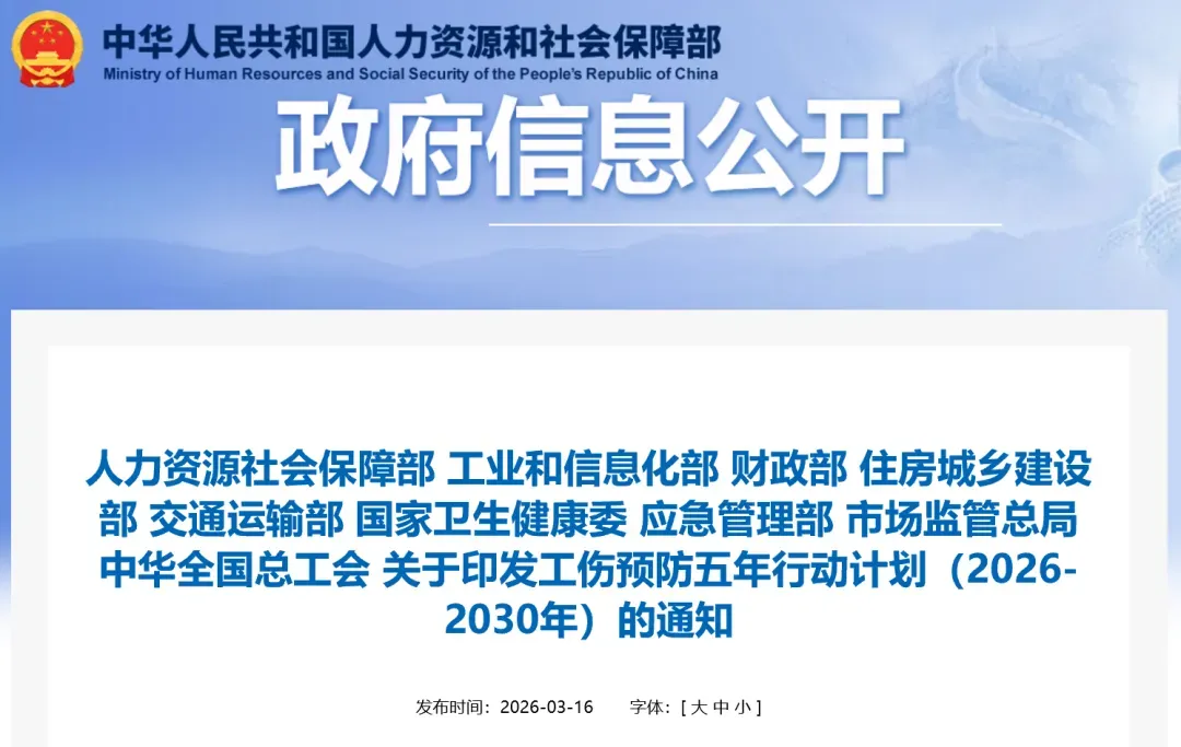 多部门联合发布《工伤预防五年行动计划(2026-2030年)》,要求重点行业工伤事故发生率5年降10%左右,新就业形态职业伤害发生率5年降10%以上,同时改善工作场所条件,降低职业病发病率。