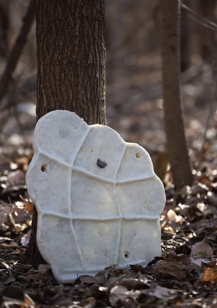 像被风轻推后背,杜蒙开始将枝叶、雨滴、水流、飞鸟和虫鸣或镶嵌,或烙印,或蚀刻,或附着在玻璃之上。是以她每一件作品的制作,都似一次生态捕捉,凝留下最触动她的自然的样子。而烧制后,与玻璃本身融为一体的是她作为创作者至珍的感受与回忆,在微光下闪闪发亮。