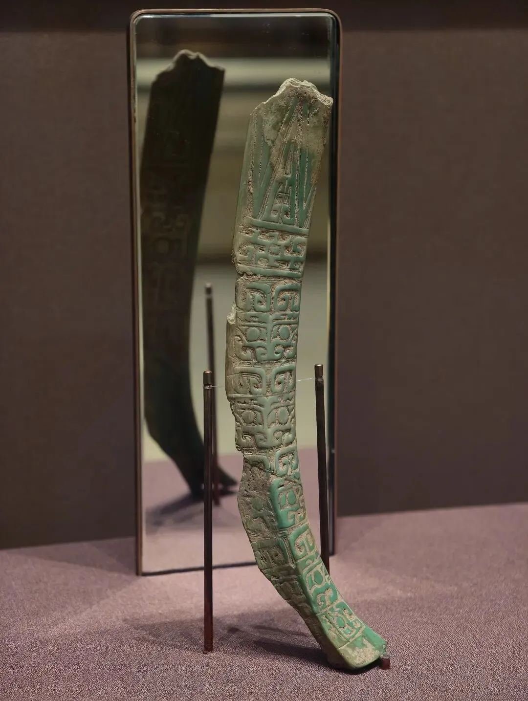 柶也称匕,是用于取饭进食的匙。这件骨柶,双面满地雕刻兽面纹和蝉纹,采用了线刻和浅浮雕手法,纹饰风格与同时期青铜器接近,展现了庄重之美。