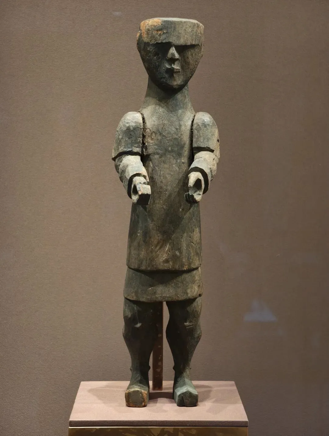 此类木俑出自战国楚地墓葬,形体扁平,大略雕出轮廓,彩绘五官、服饰等细节,抽象、简洁、具有设计感。木俑的制作不是为了观赏,而是代替活人在地下世界继续侍奉墓葬主人,写实性在这里被忽略了。