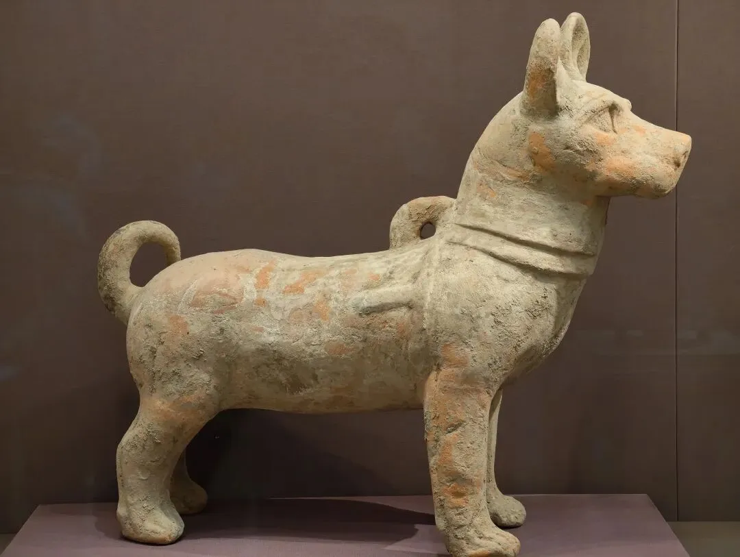 这件红陶质地的陶狗,出自川渝地区东汉中晚期墓葬。陶狗脖颈部位留有合范痕迹,应是先翻模做出部件,再粘结在一起,然后进行局部修饰与捏塑。