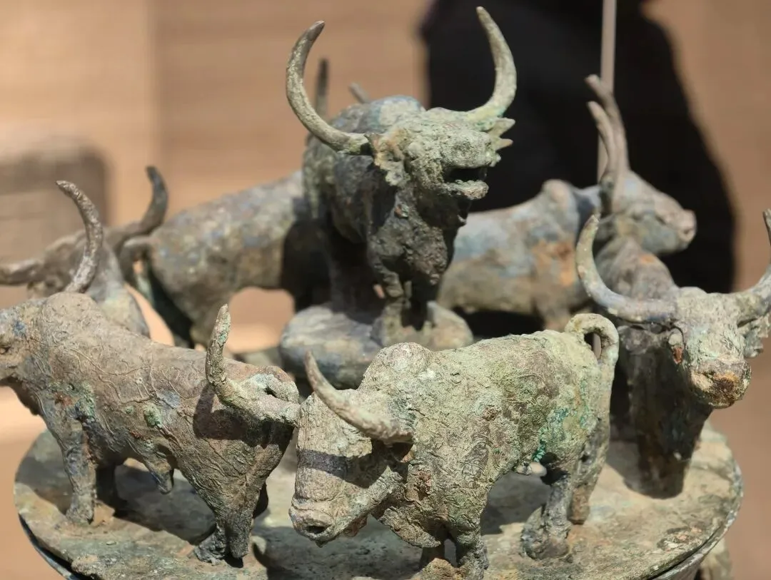 这是件滇文化青铜器。此类器物出土时多装有贝壳,故得名贮贝器。器身以双虎为把手,器顶圆雕七牛。仿佛两虎将牛群围困于器顶,将虎与牛对峙的紧张态势刻画得淋漓尽致。雕塑搏斗的动物,系受到北方草原文化的影响。