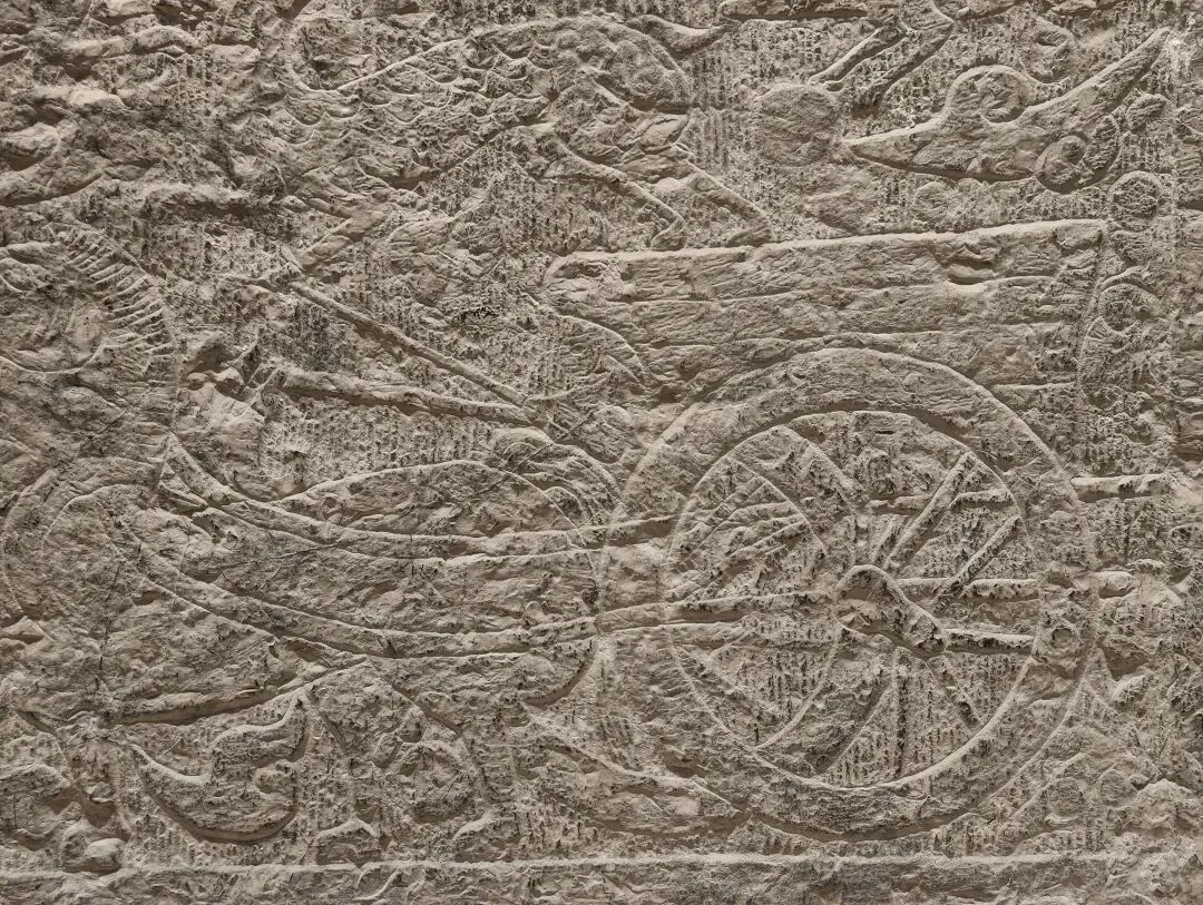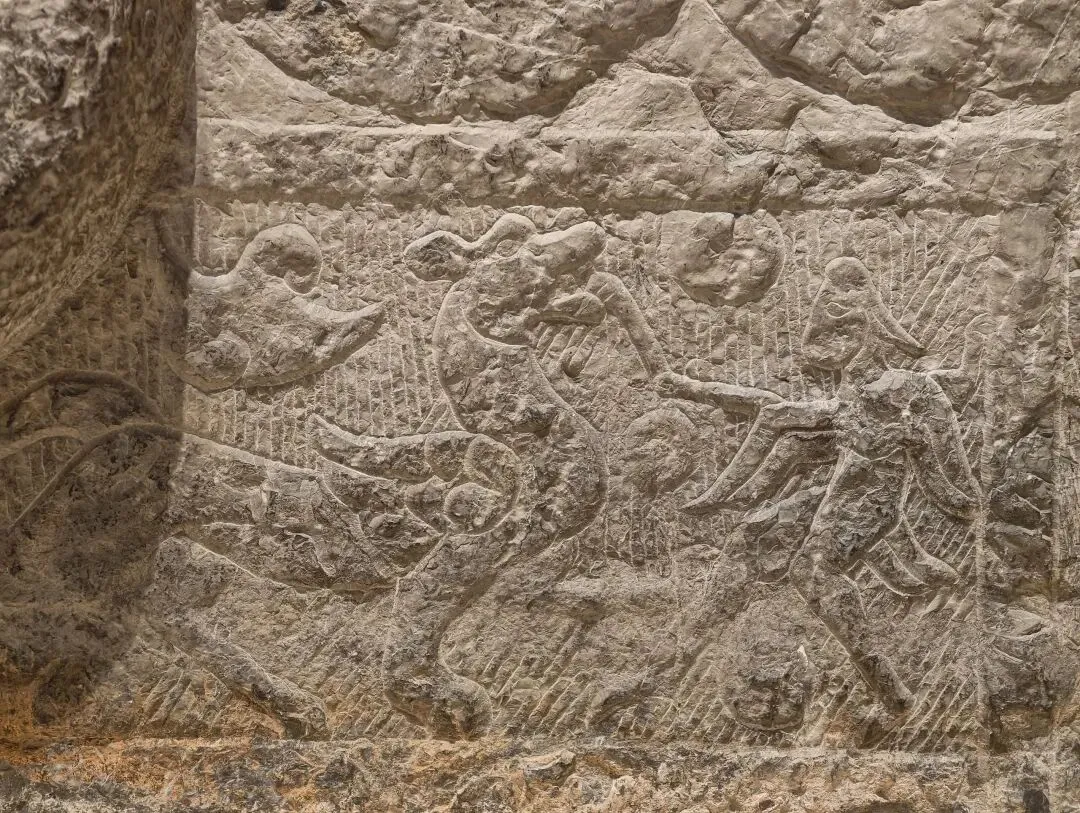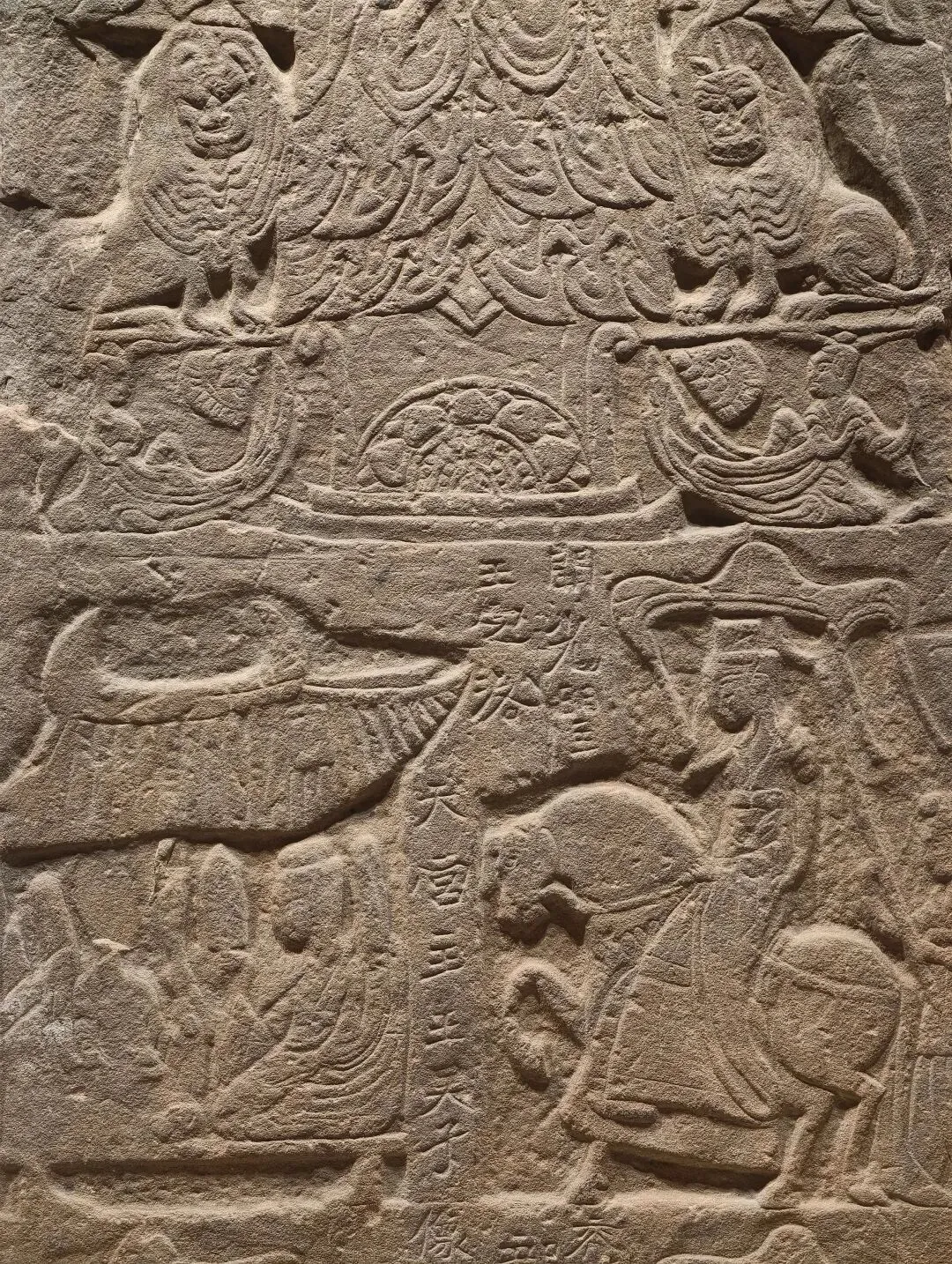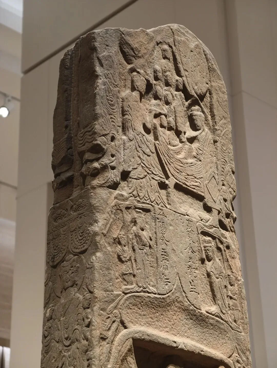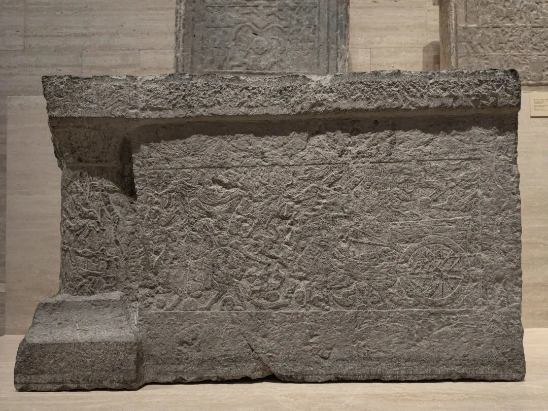 壁面和圆柱的画像是连续的整体,表现墓主灵魂乘坐轺车,在导骑引领下升天成仙的场景,四周雕刻表现天界的龙、神兽、羽人、云气、星宿等题材。此画像石源自山东济南或周边地区的东汉中晚期画像石墓。