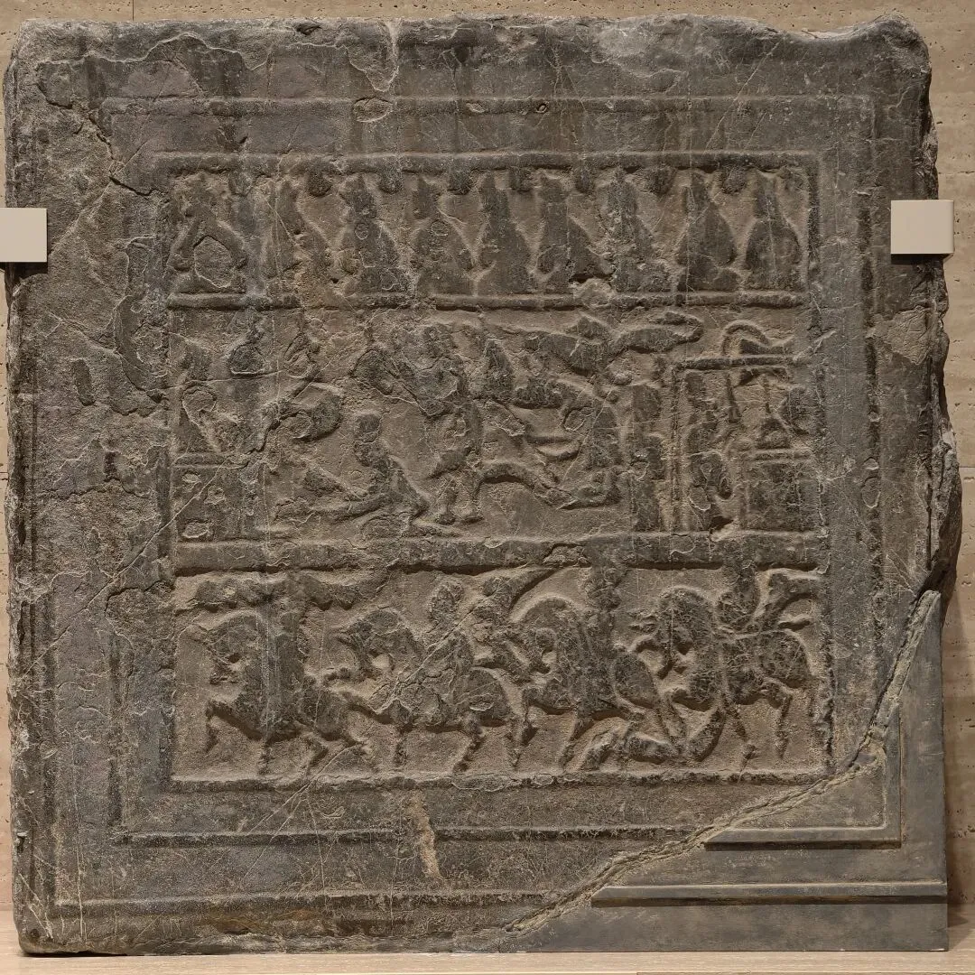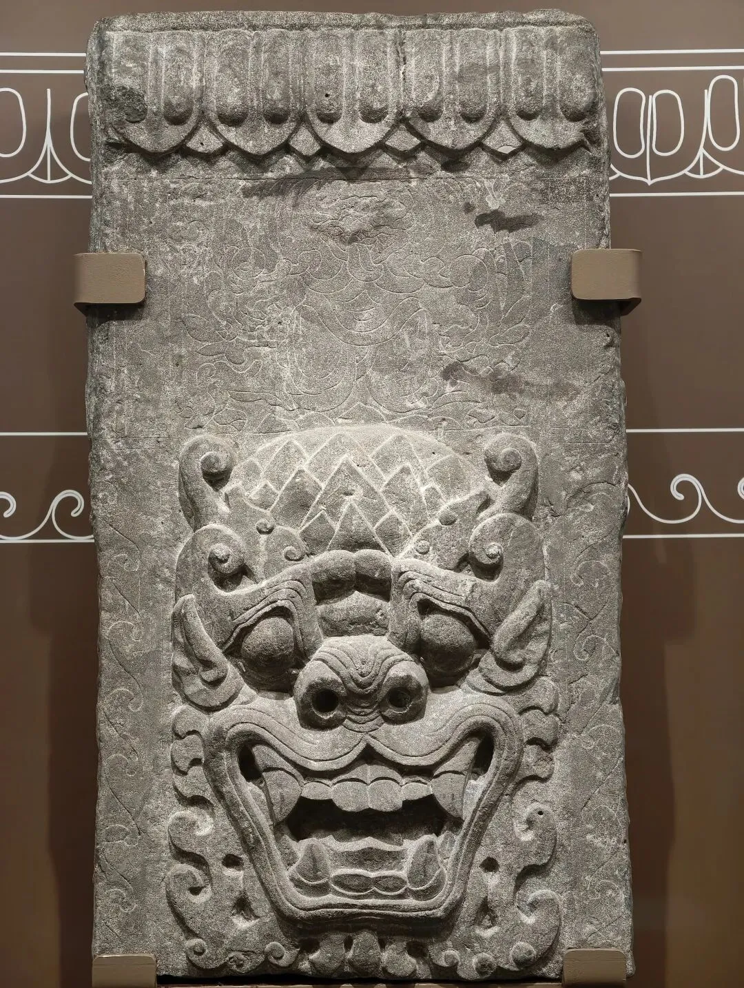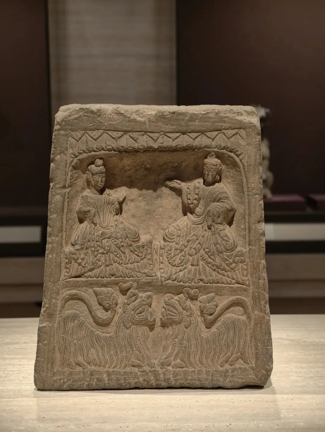 此残件是石棺床的正立面中间部分和床腿,立面上部为重层宝装莲瓣,下部界格中浅浮雕一畏兽,床腿上高浮雕一兽面,时代为北魏晚期至东魏。画像石棺床是北朝高等级墓葬中的奢华葬具,其上放置棺柩或尸身,来源于现实生活中的床榻。
