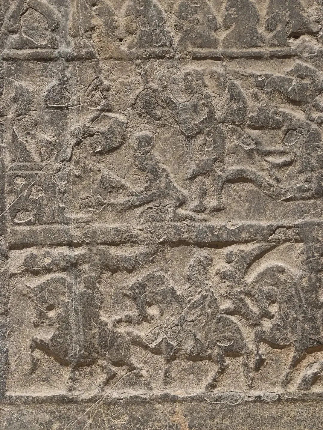 画像石顶部中央为西王母,两侧众侍者环绕,下方有九尾狐、三青鸟、玉蟾等与西王母有关的神兽。中间一层左侧为击建鼓、跳丸等百戏表演,右侧为五位骑马的戴尖角帽胡人。最下层为四辆軿车向左驶去。