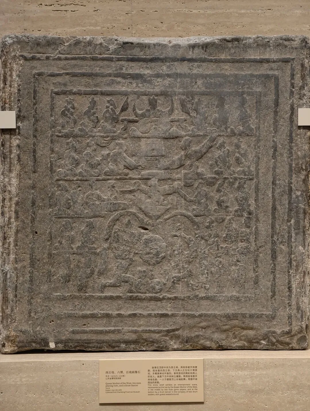 画像石顶部中央为西王母,两侧侍者手持便面、跽坐面向西王母,下方两人正在玩六博游戏,手臂高举动作激烈,表明游戏的精彩和两人的投入。画面下方中央树立建鼓,两侧各有鼓手持槌击鼓。一人于建鼓顶上长袖起舞。周围环绕跽坐的宾客。